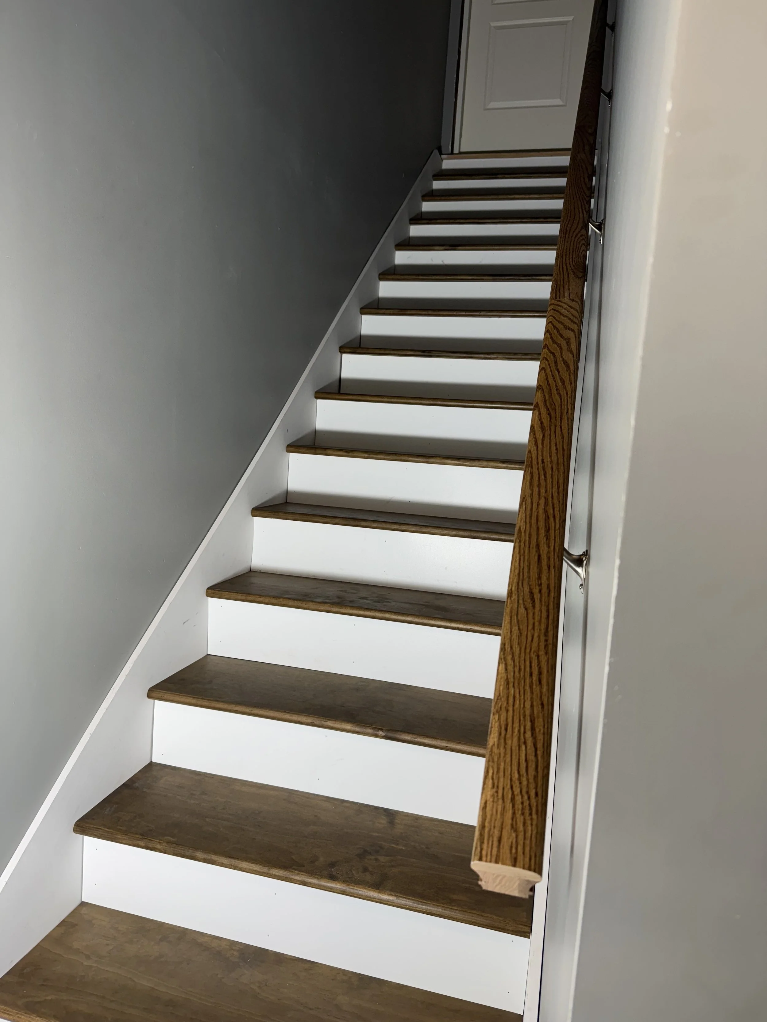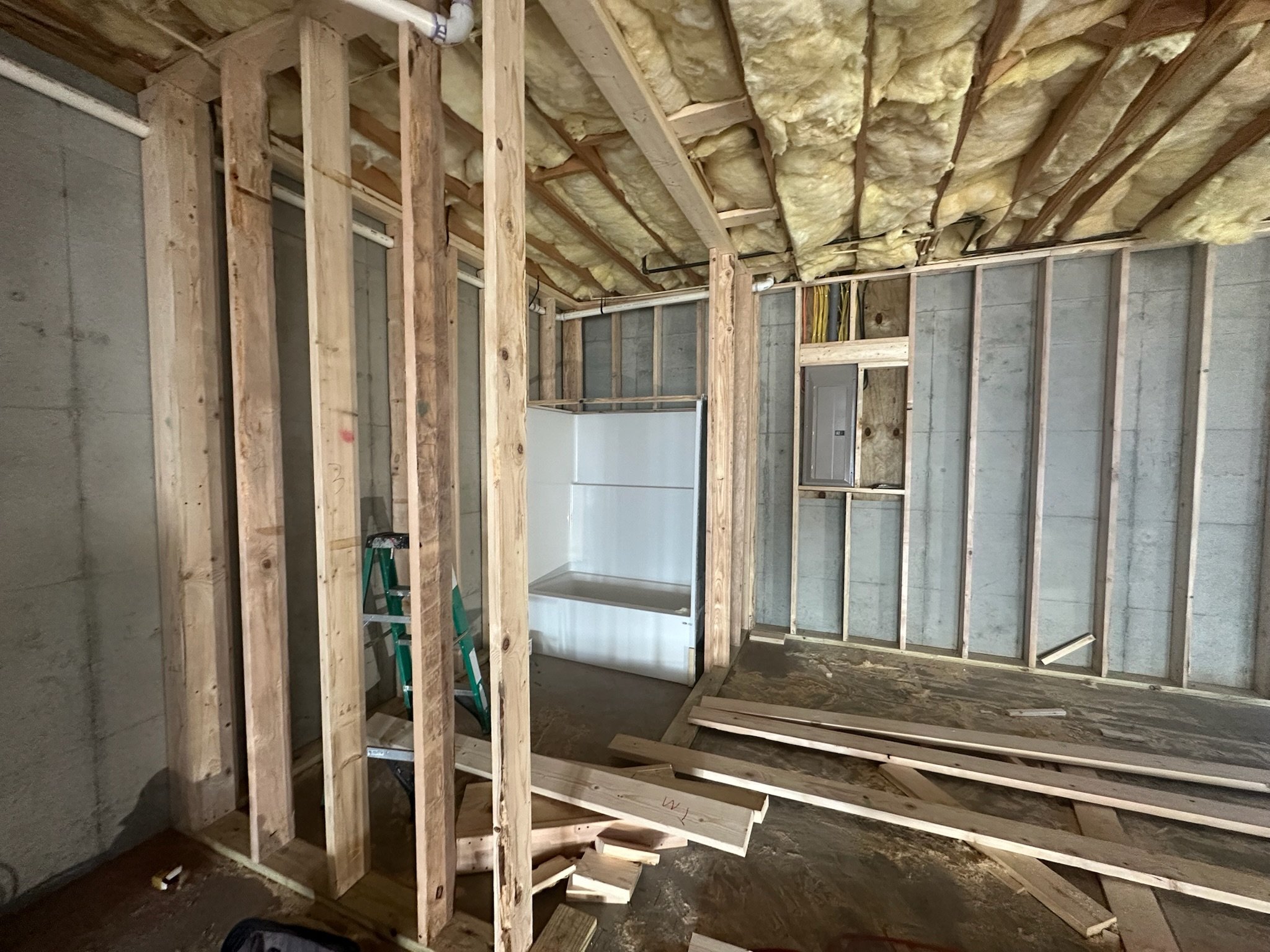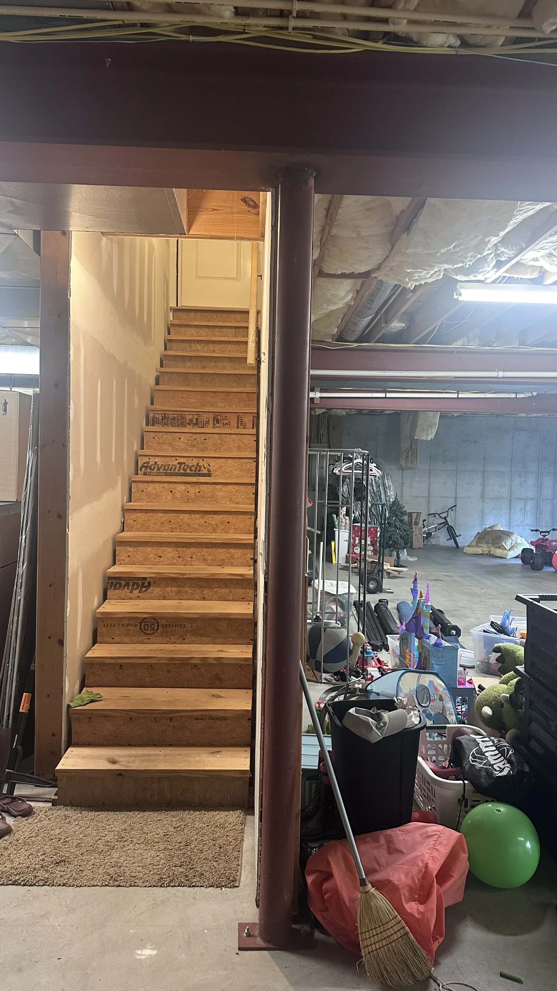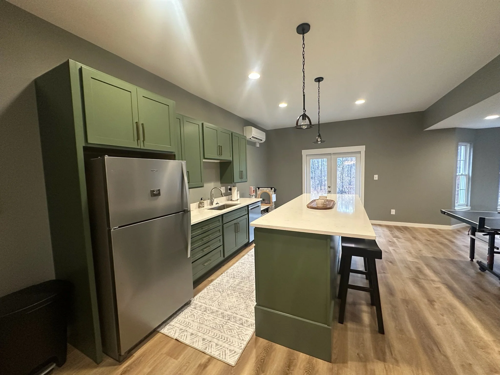 Additional features include a powder room with a matching green vanity, a convenient kitchen island with seating, and a game/recreation area with a ping-pong table. The project also addressed basement access with both unfinished wooden stairs during construction and finished stairs with proper risers and treads in the completed space.