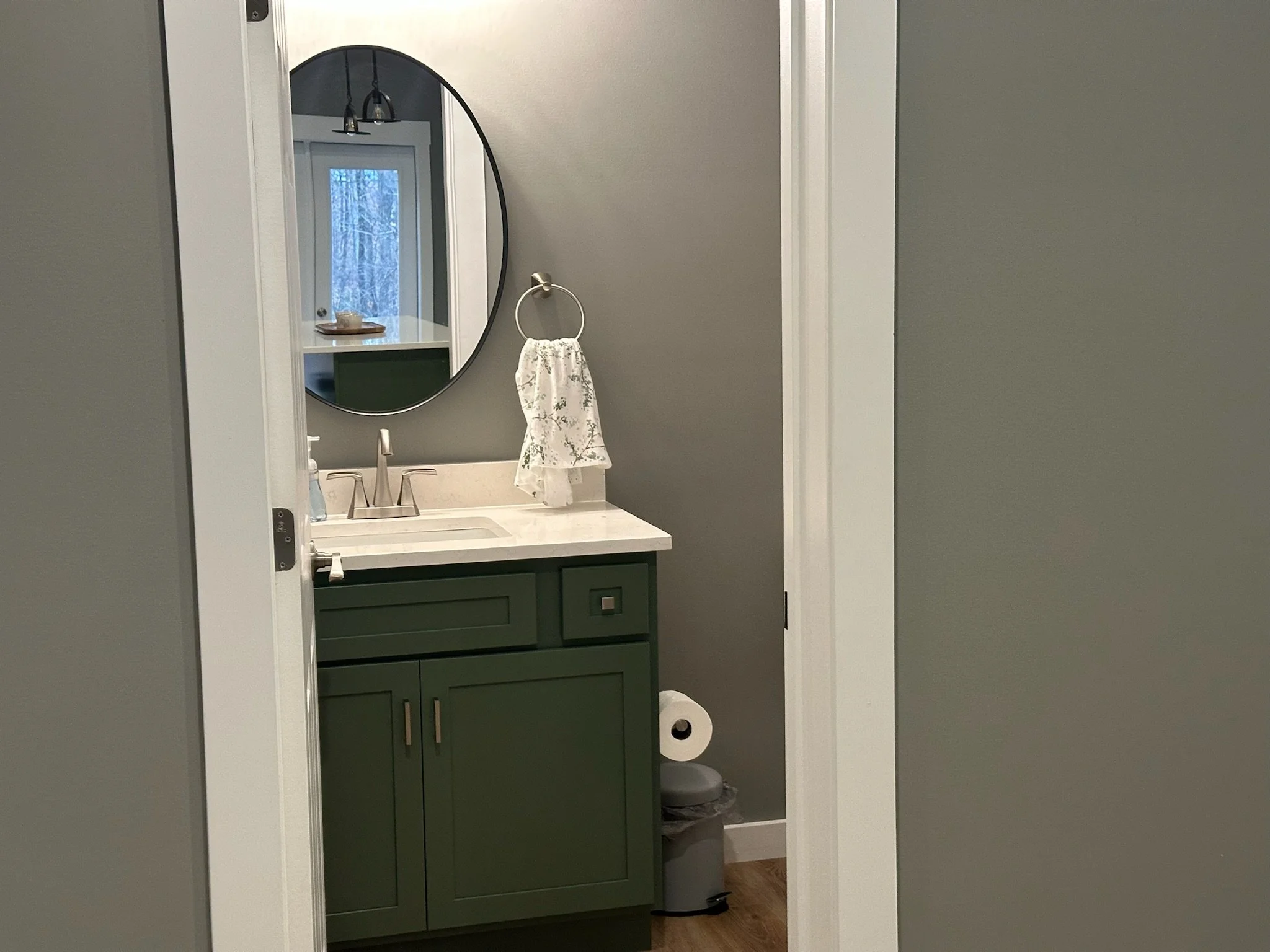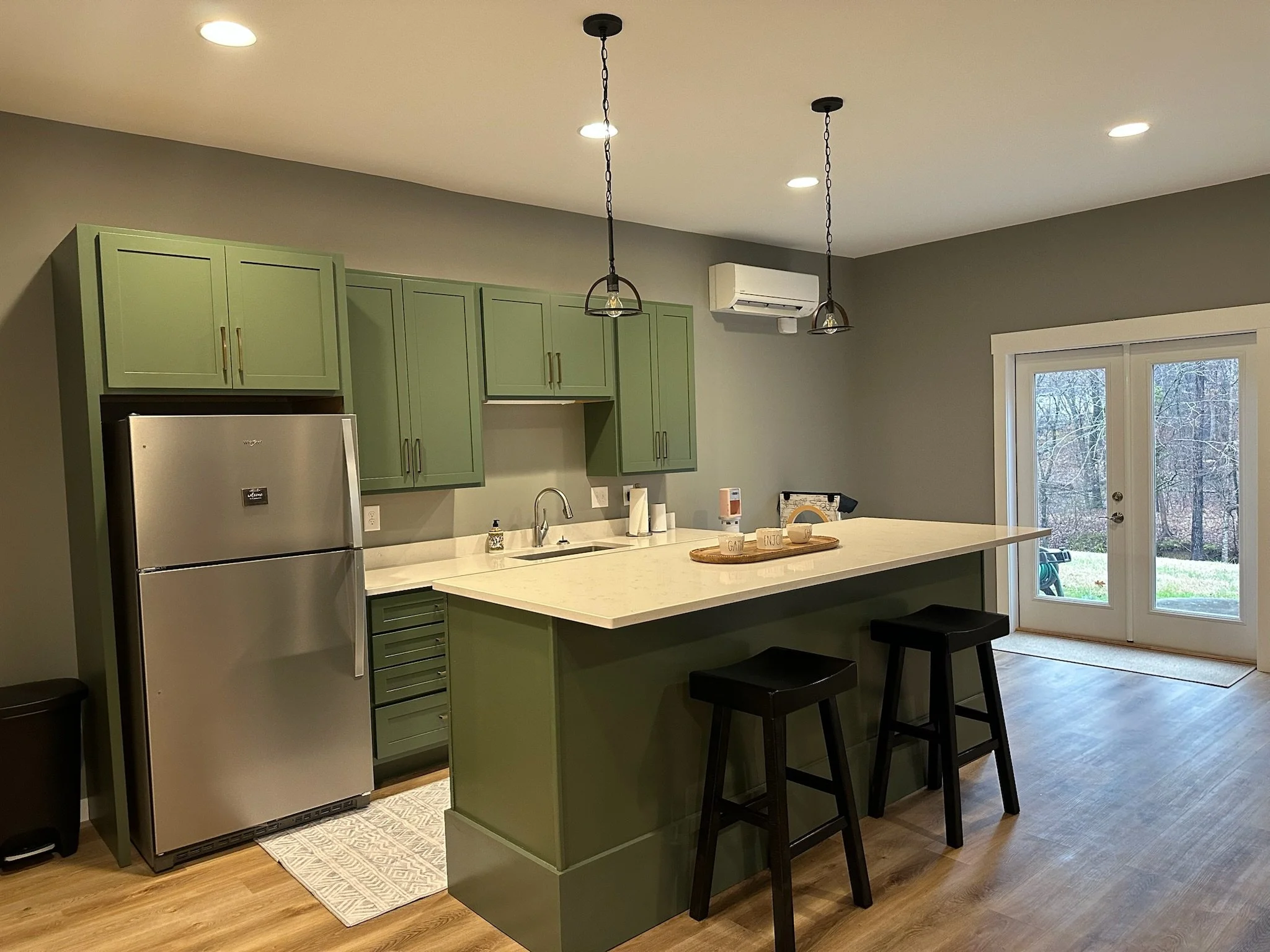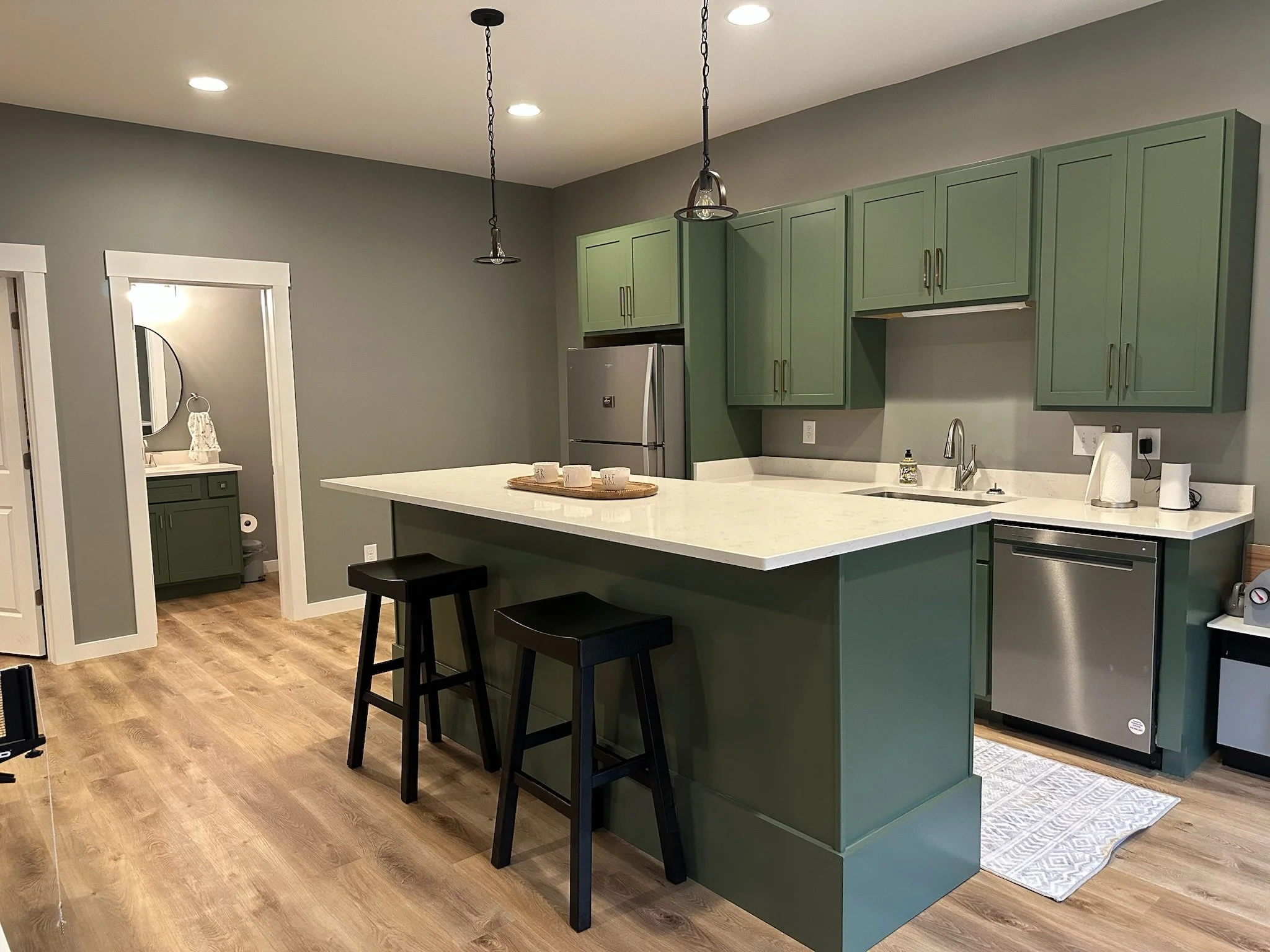 The finished space includes an open-concept kitchen and living room with sage green cabinetry, quartz countertops, and high-end stainless steel appliances.
