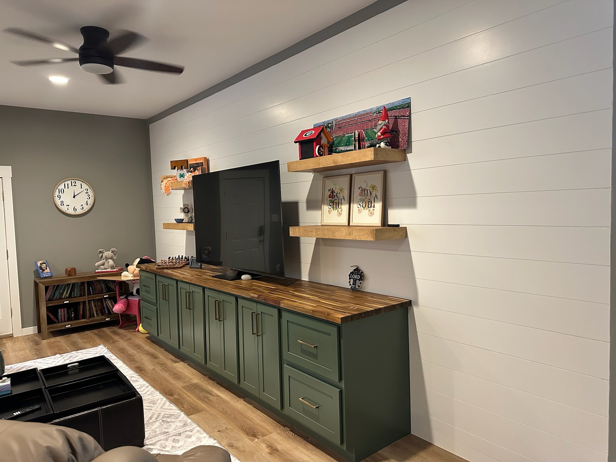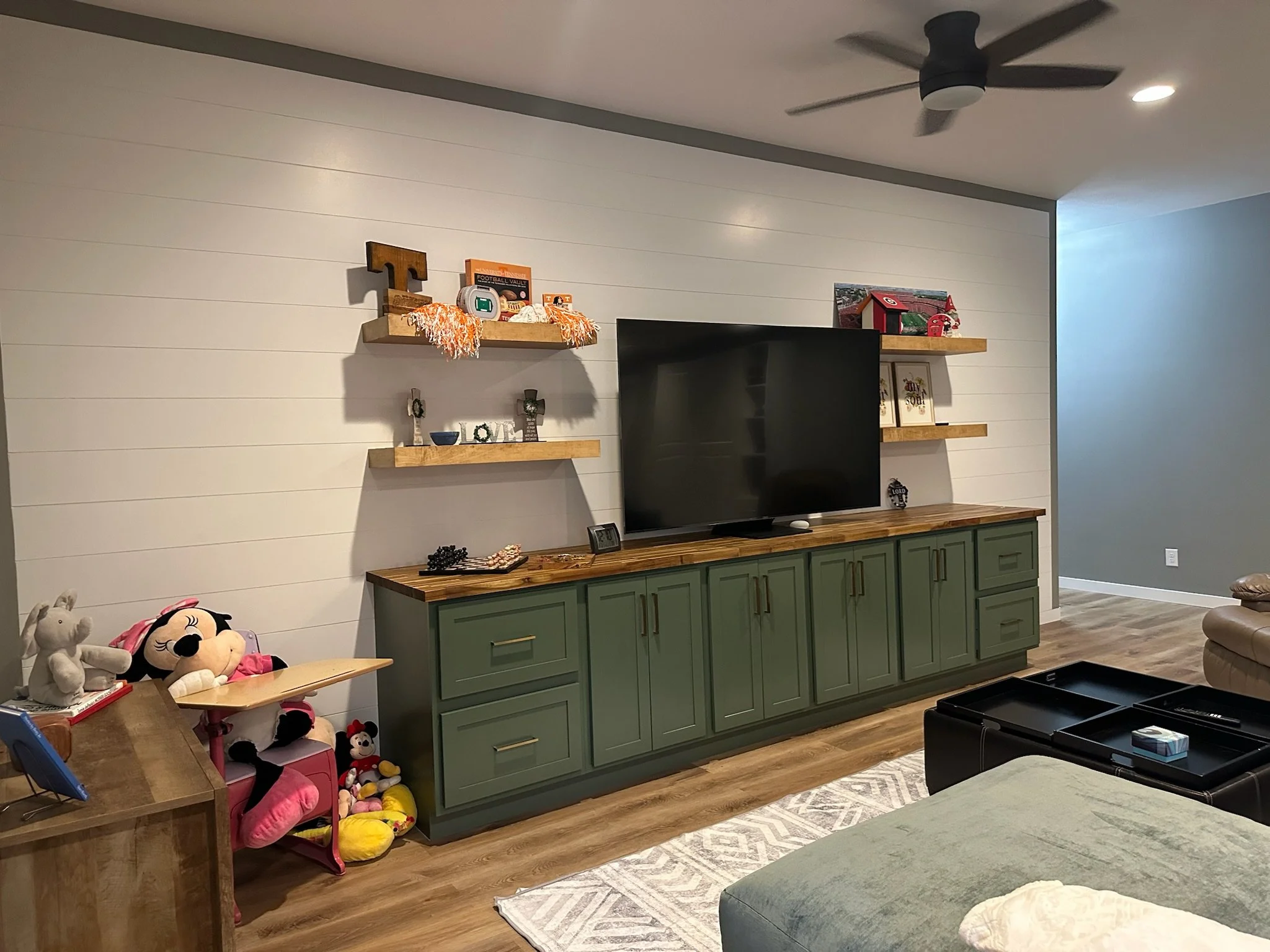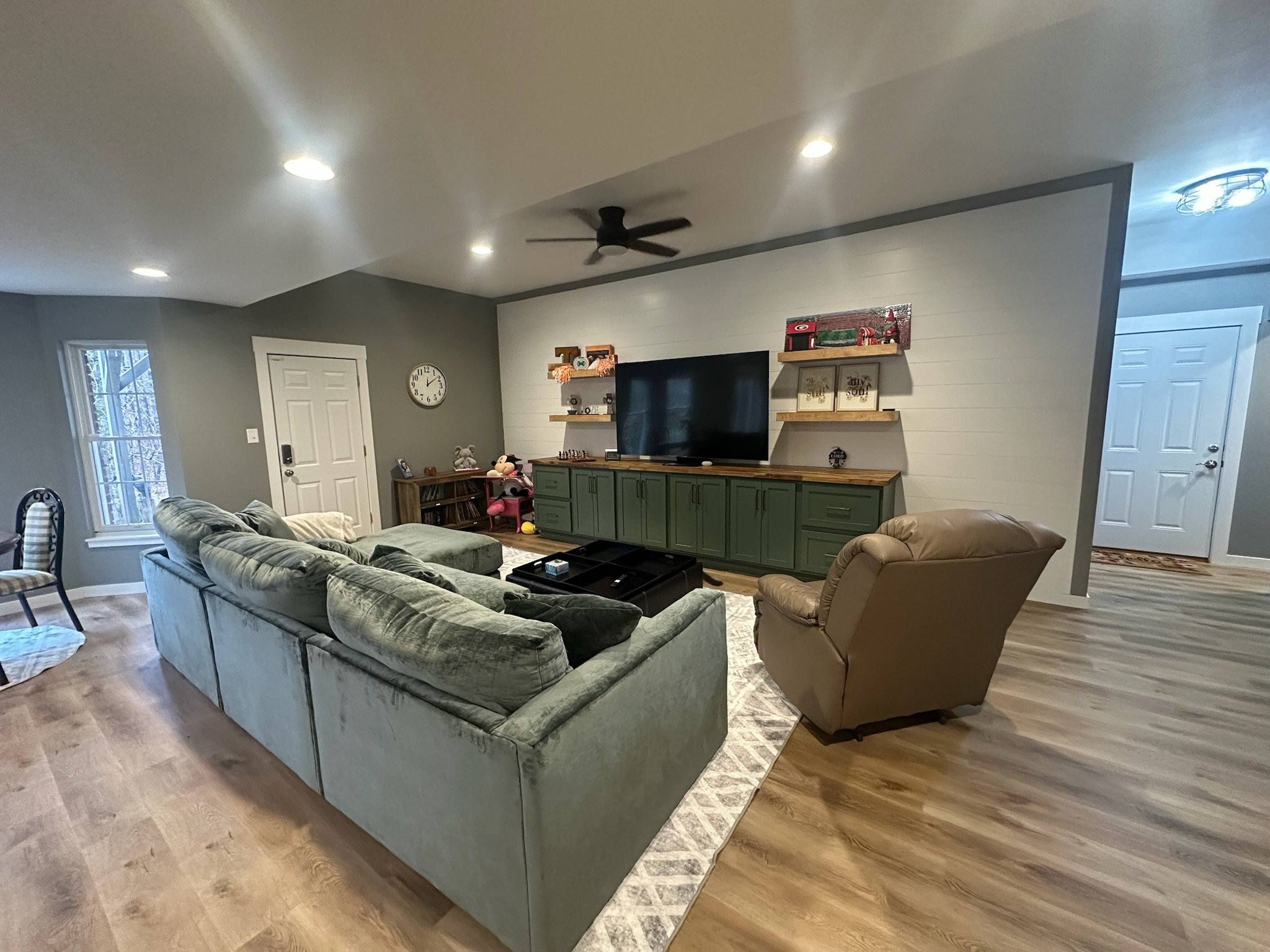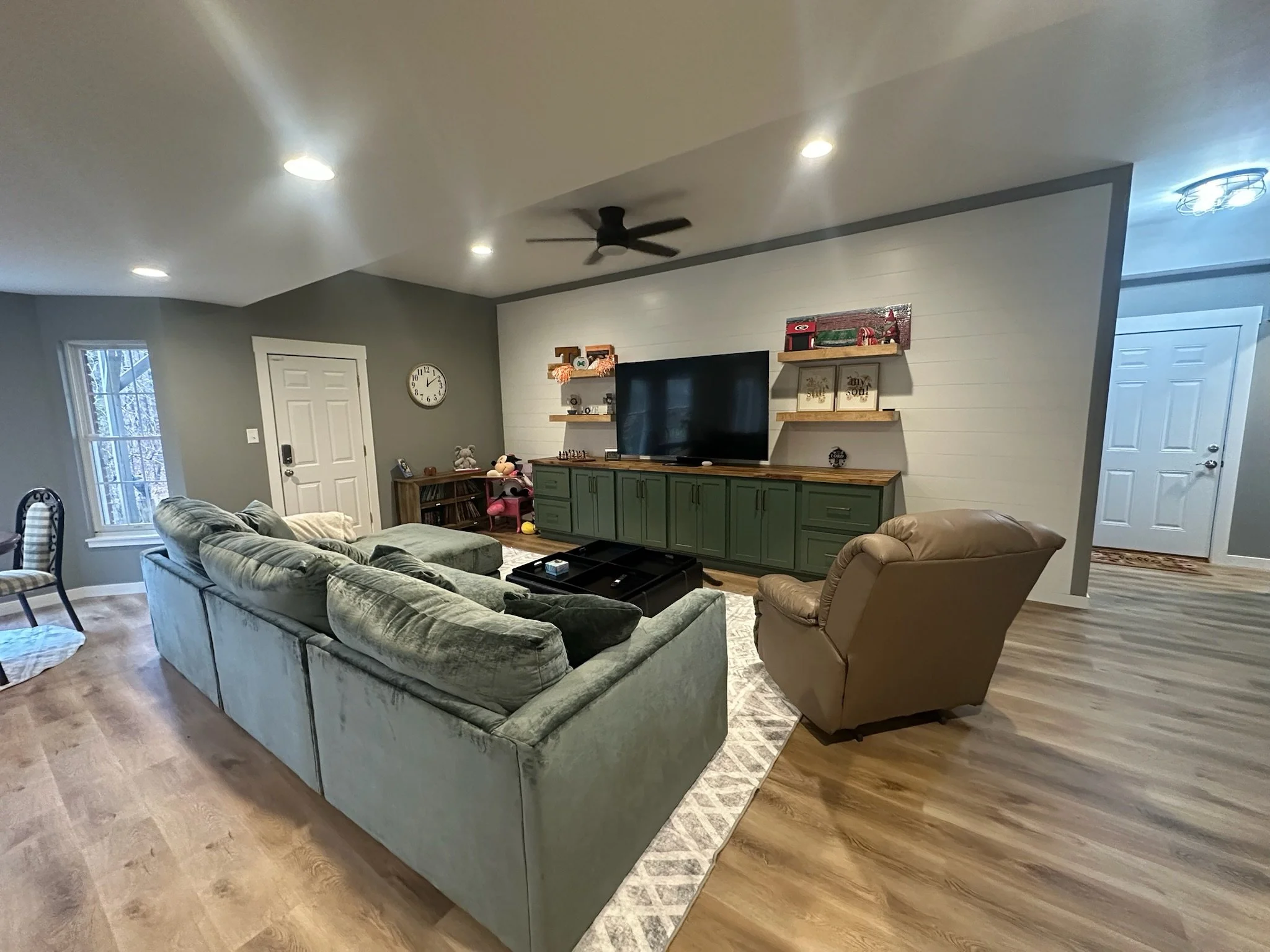 The design includes recessed lighting, ceiling fans, and a cohesive color palette of gray walls complemented by warm wood-toned luxury vinyl flooring.