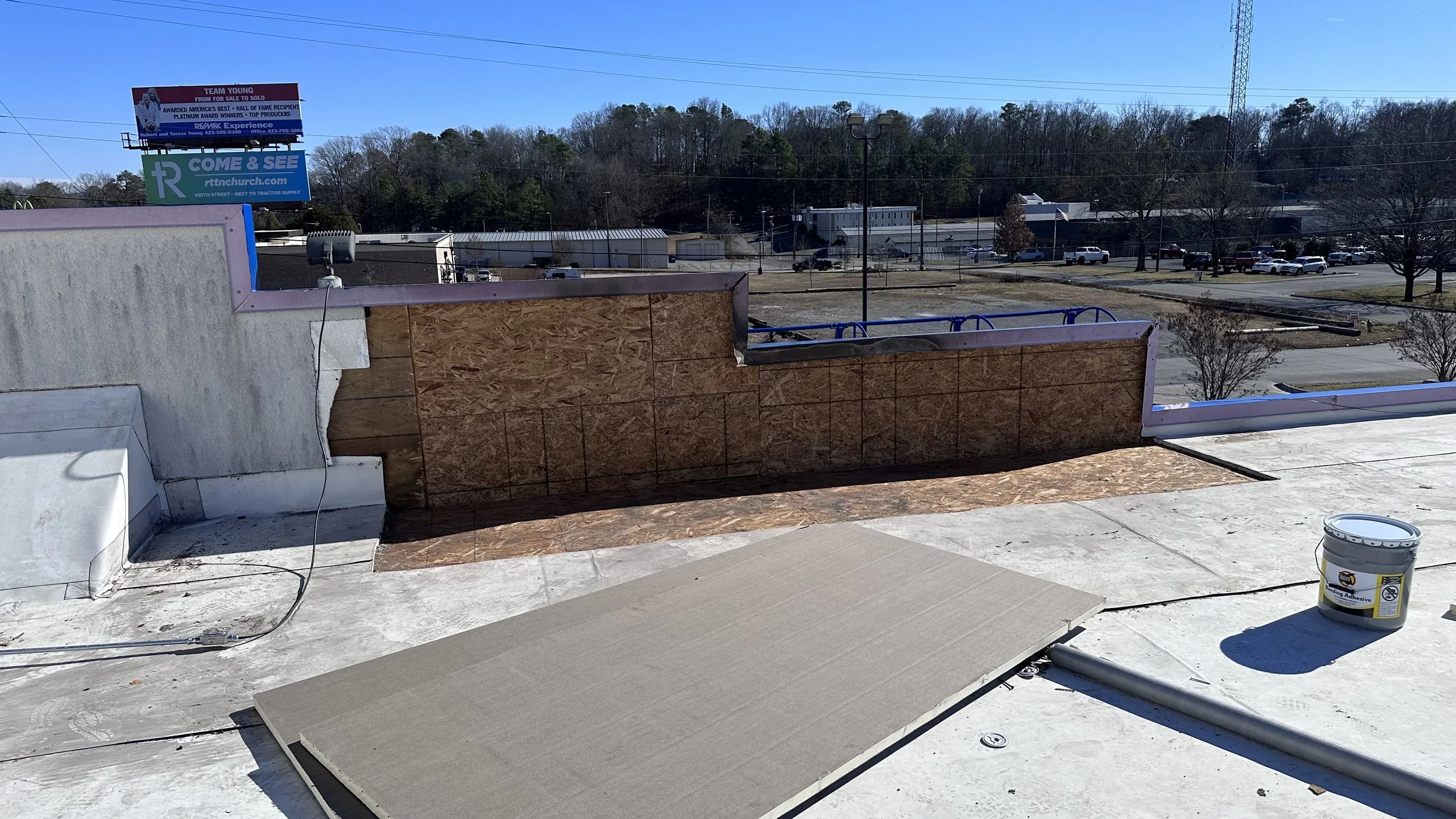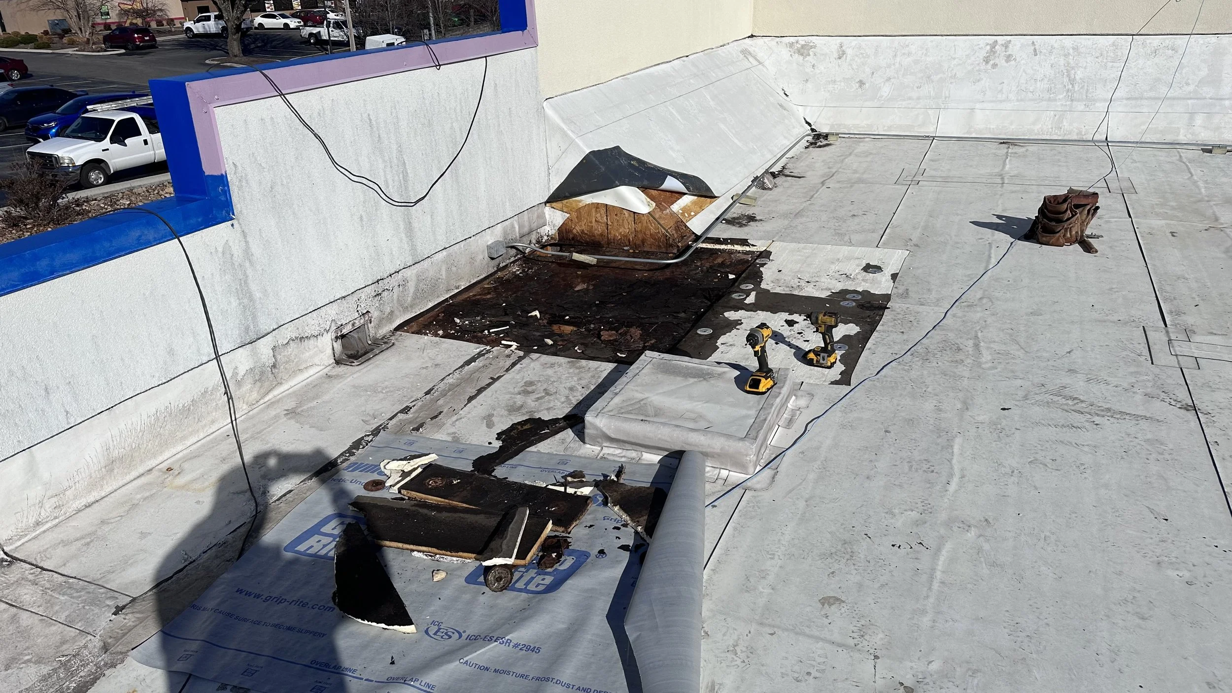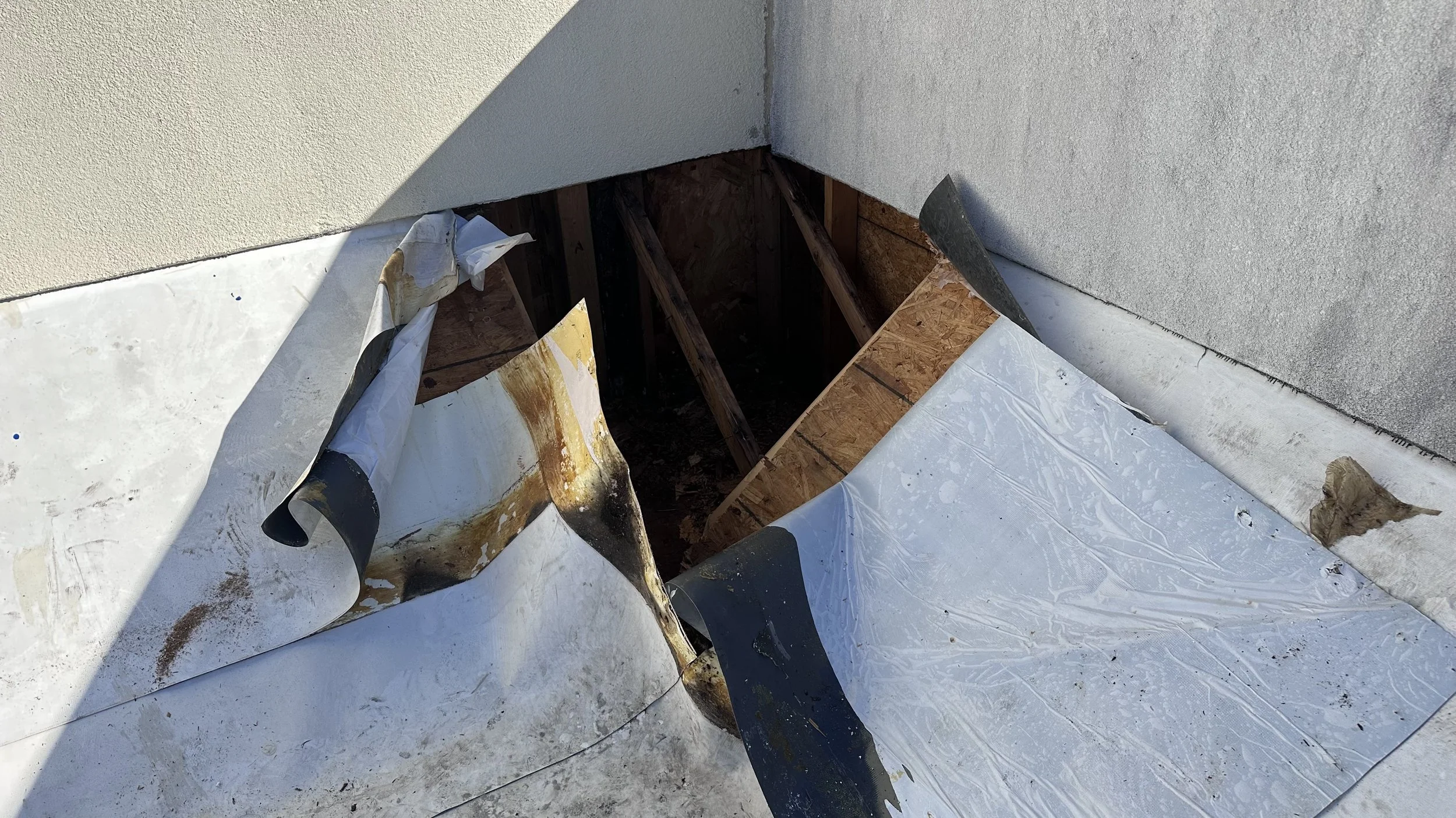 The inspection revealed damaged insulation, deteriorated wooden decking, and compromised parapet walls that were allowing moisture to penetrate the building envelope. Working methodically, we removed the damaged sections of roofing material, exposing the extent of the problem and creating a clear path for comprehensive repairs.