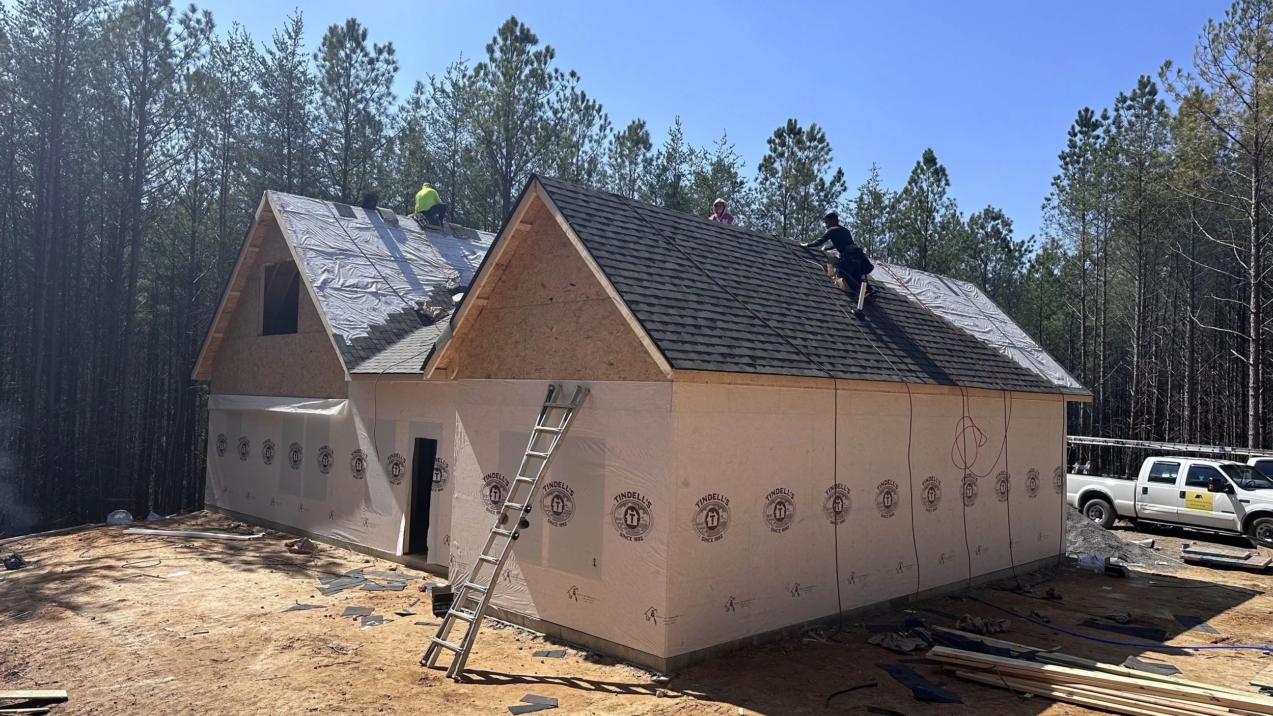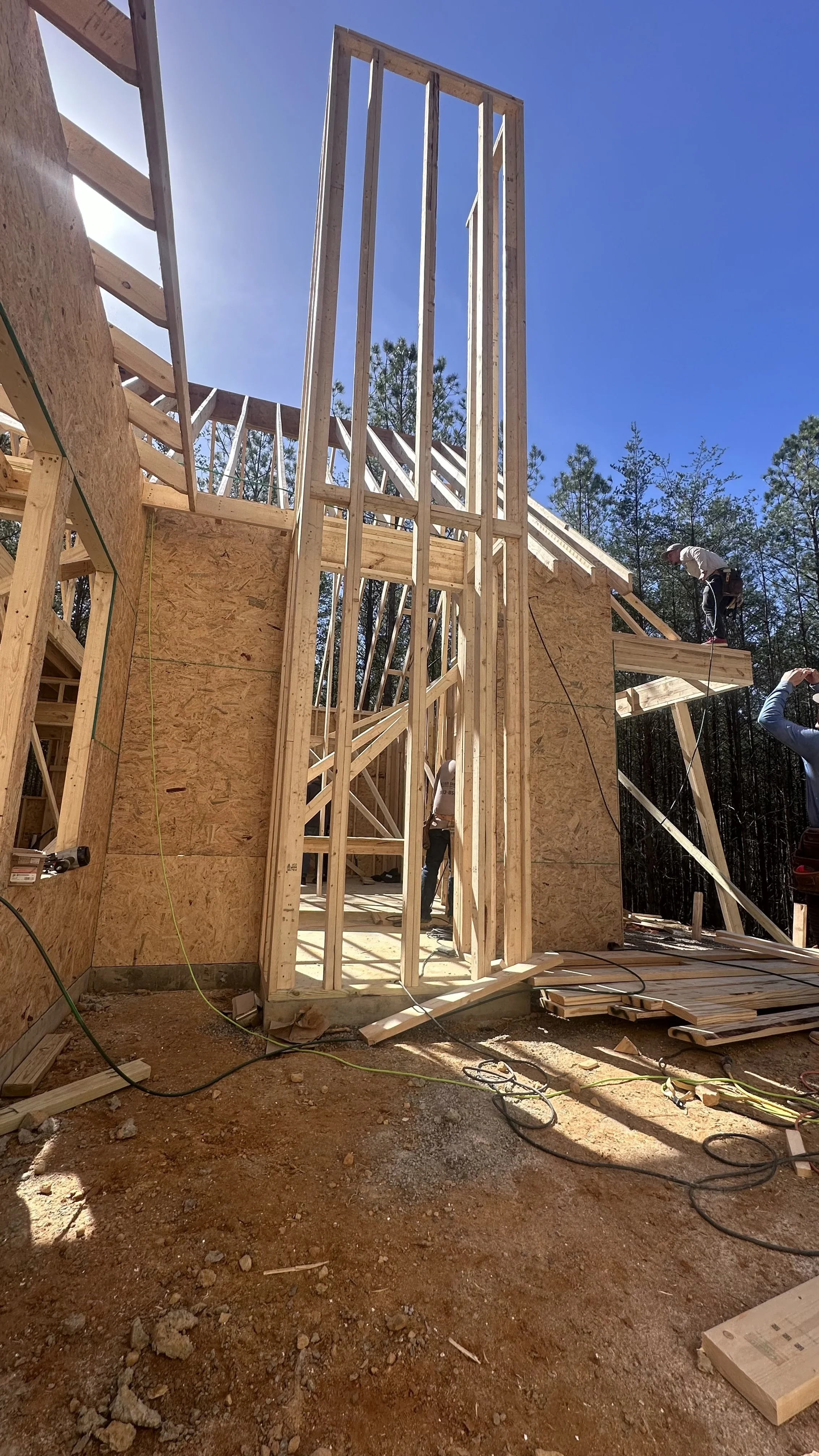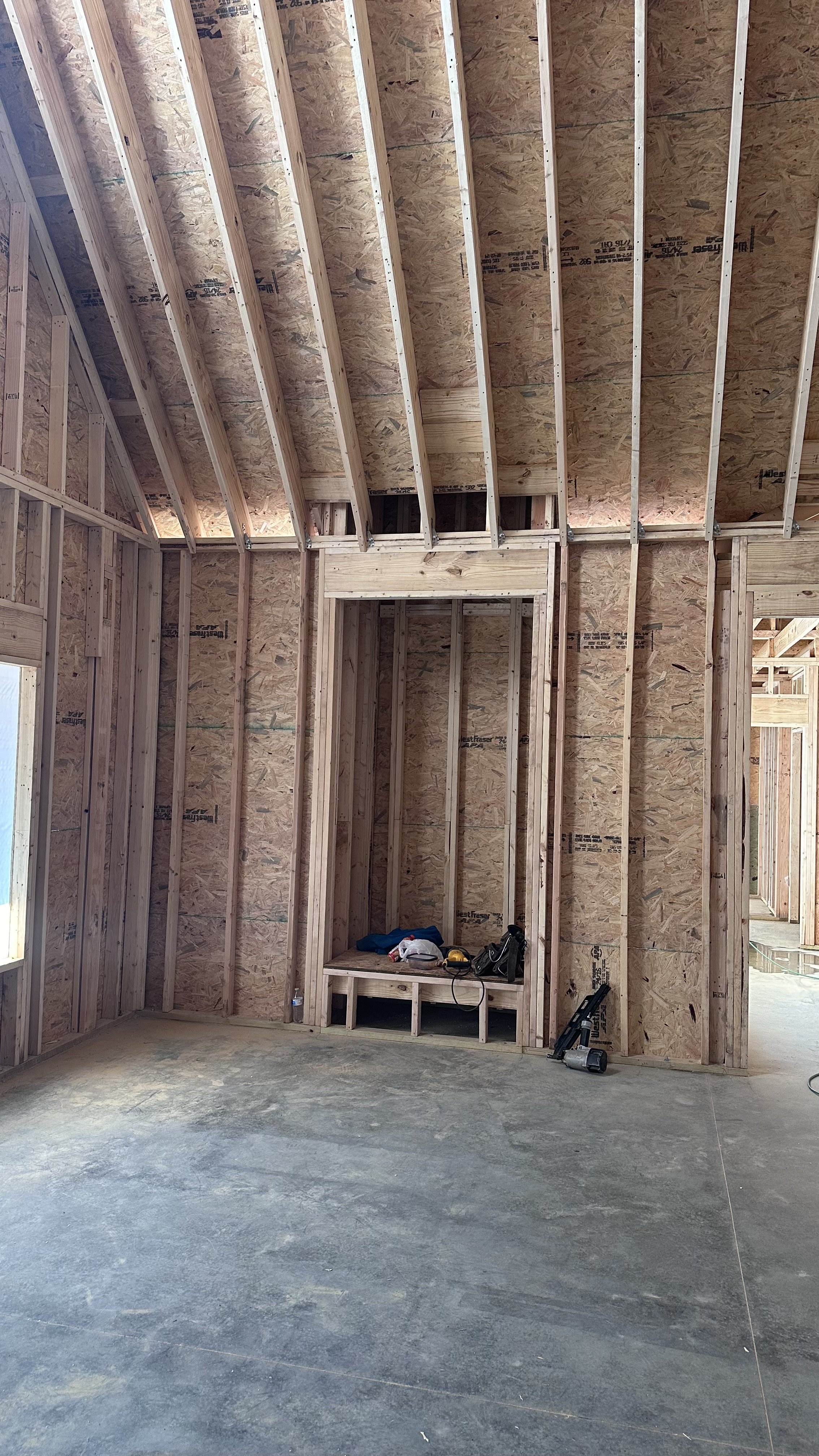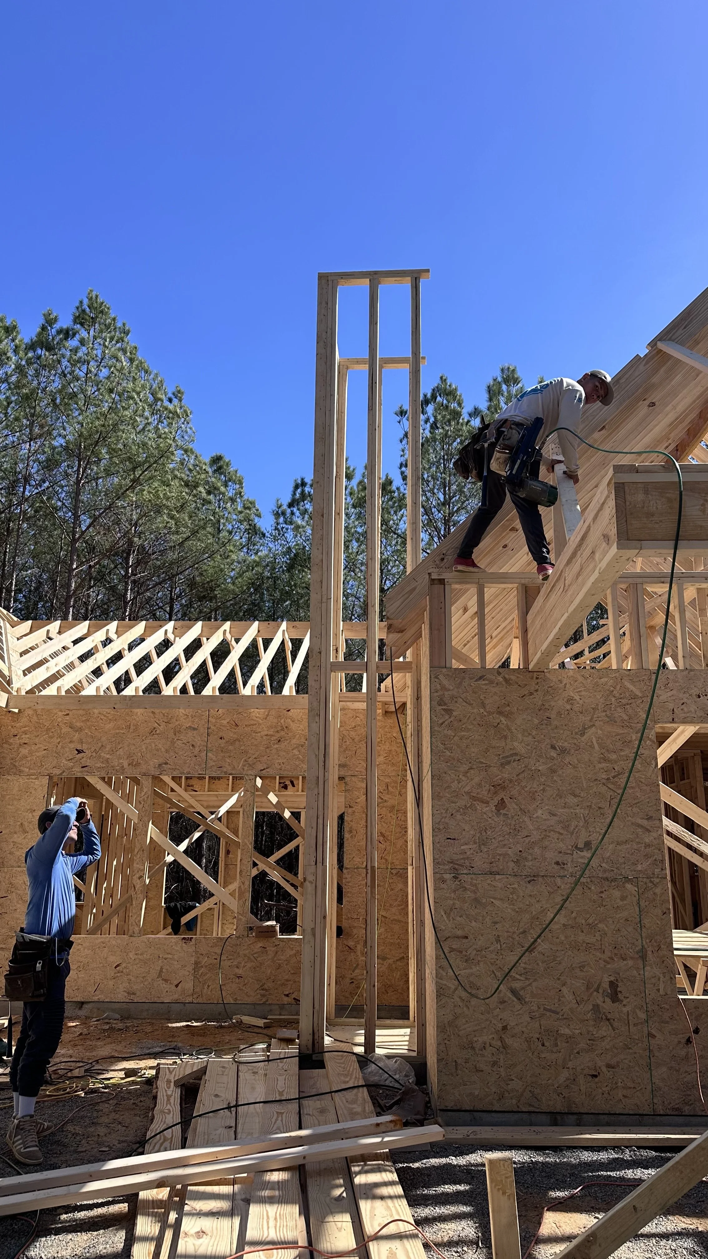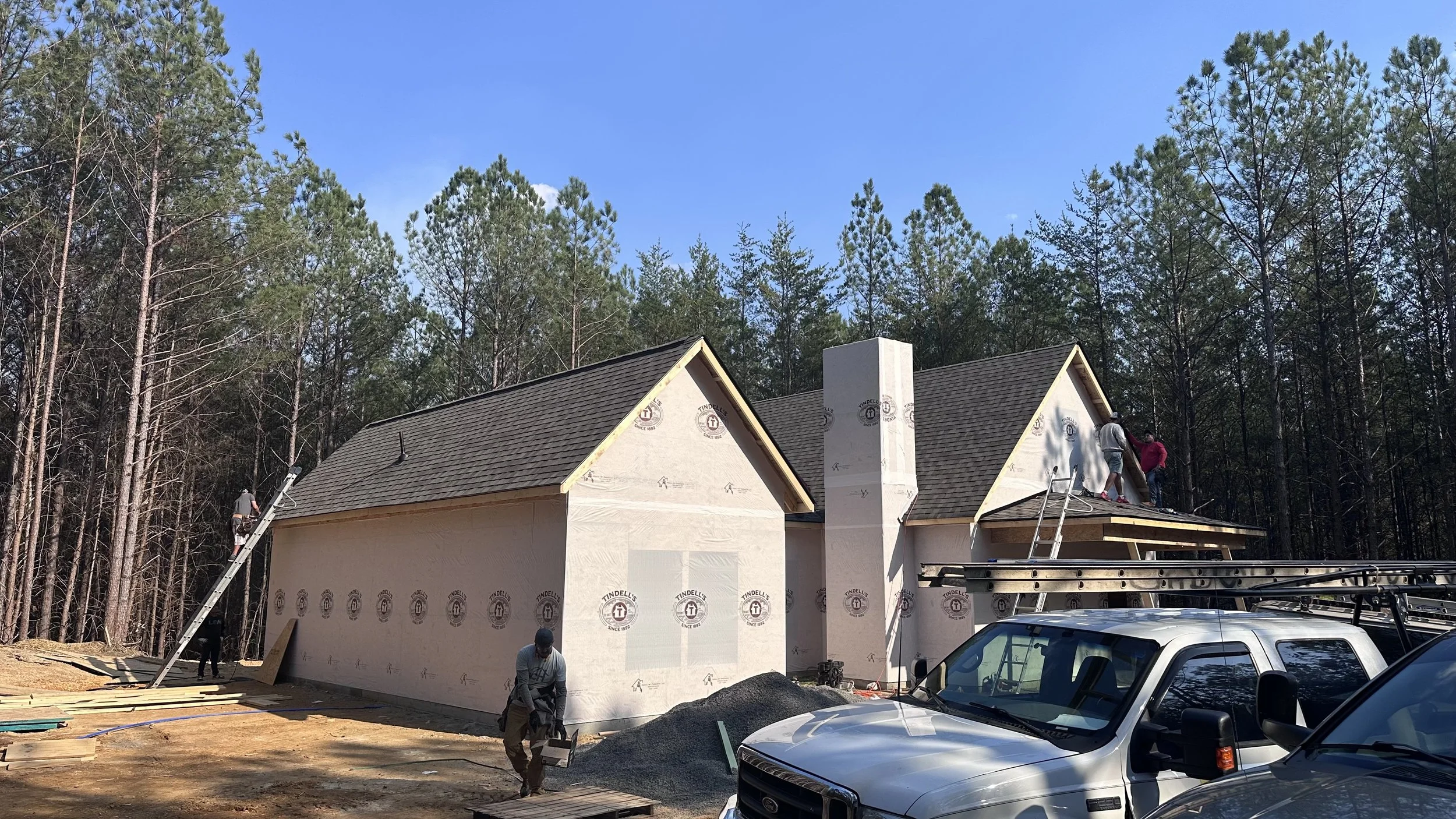 As the framing gave way to roofing and insulation, the home’s signature style took shape—steep rooflines, dark vertical siding, and striking architectural features like the stone-wrapped chimney.