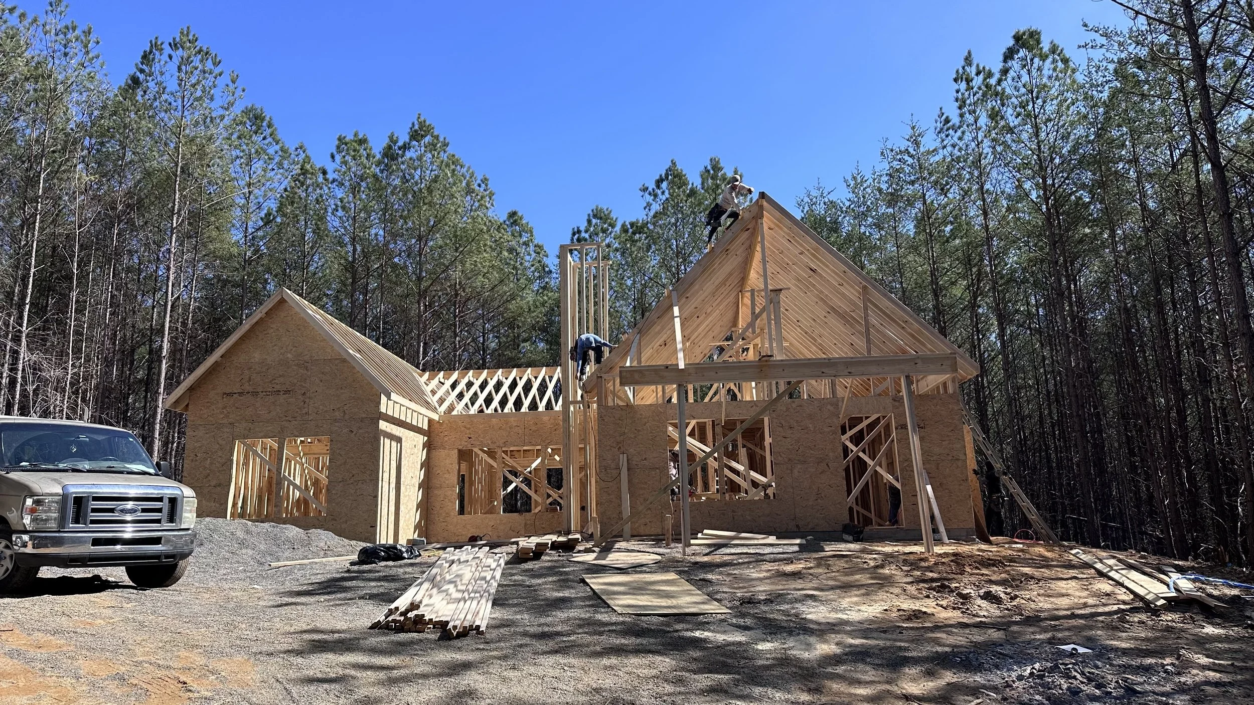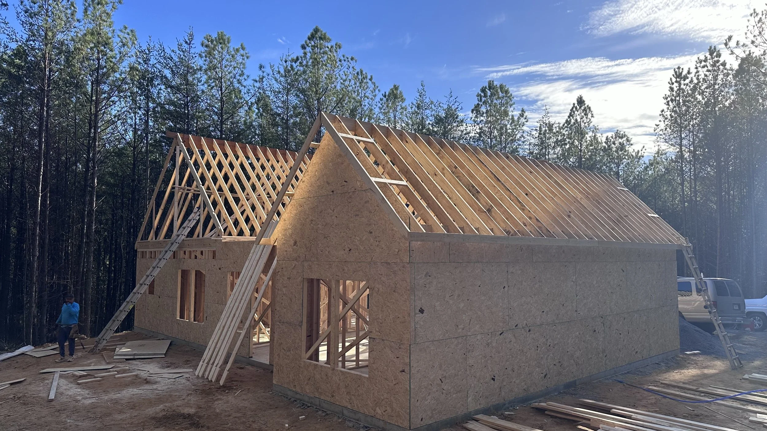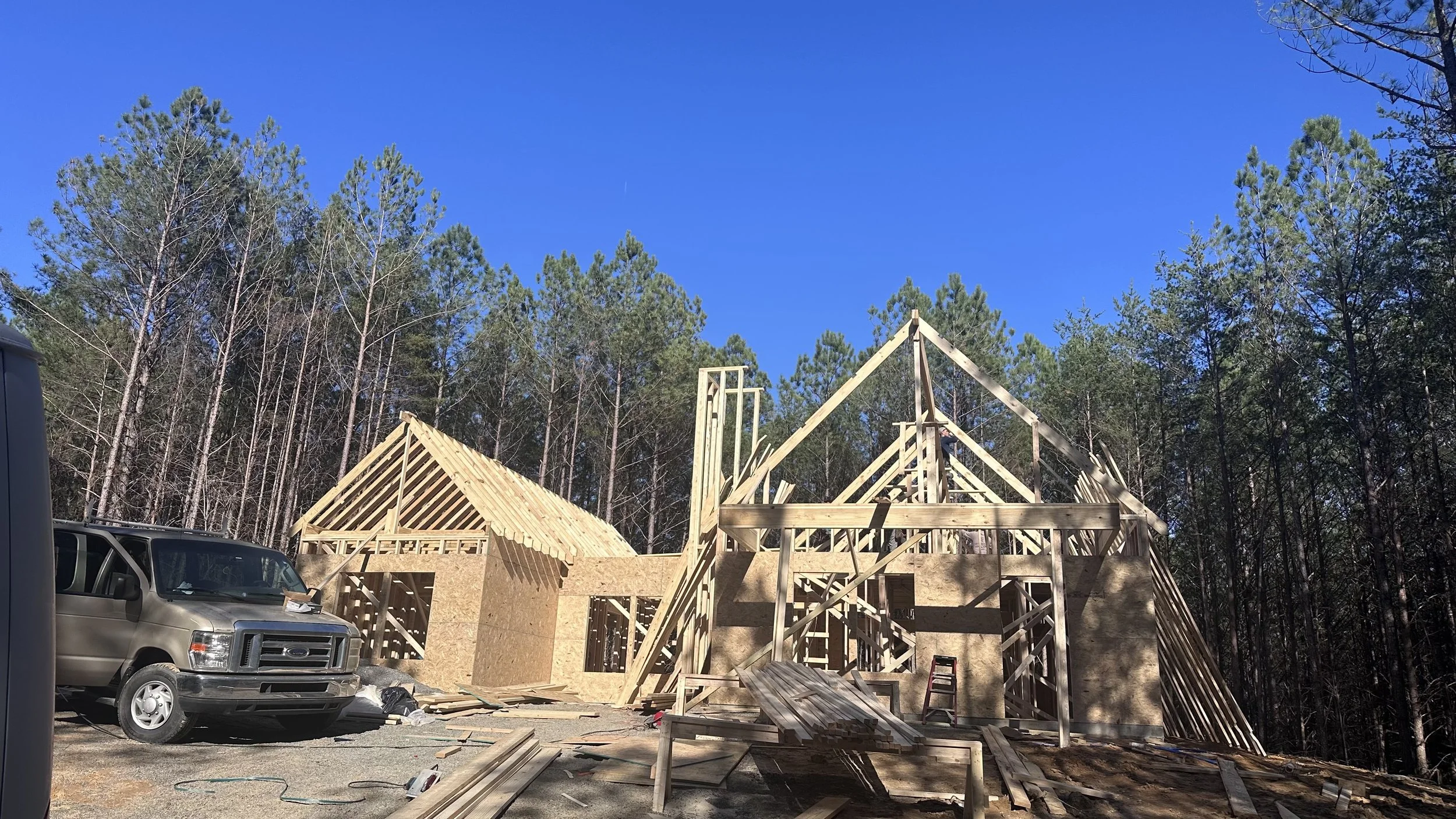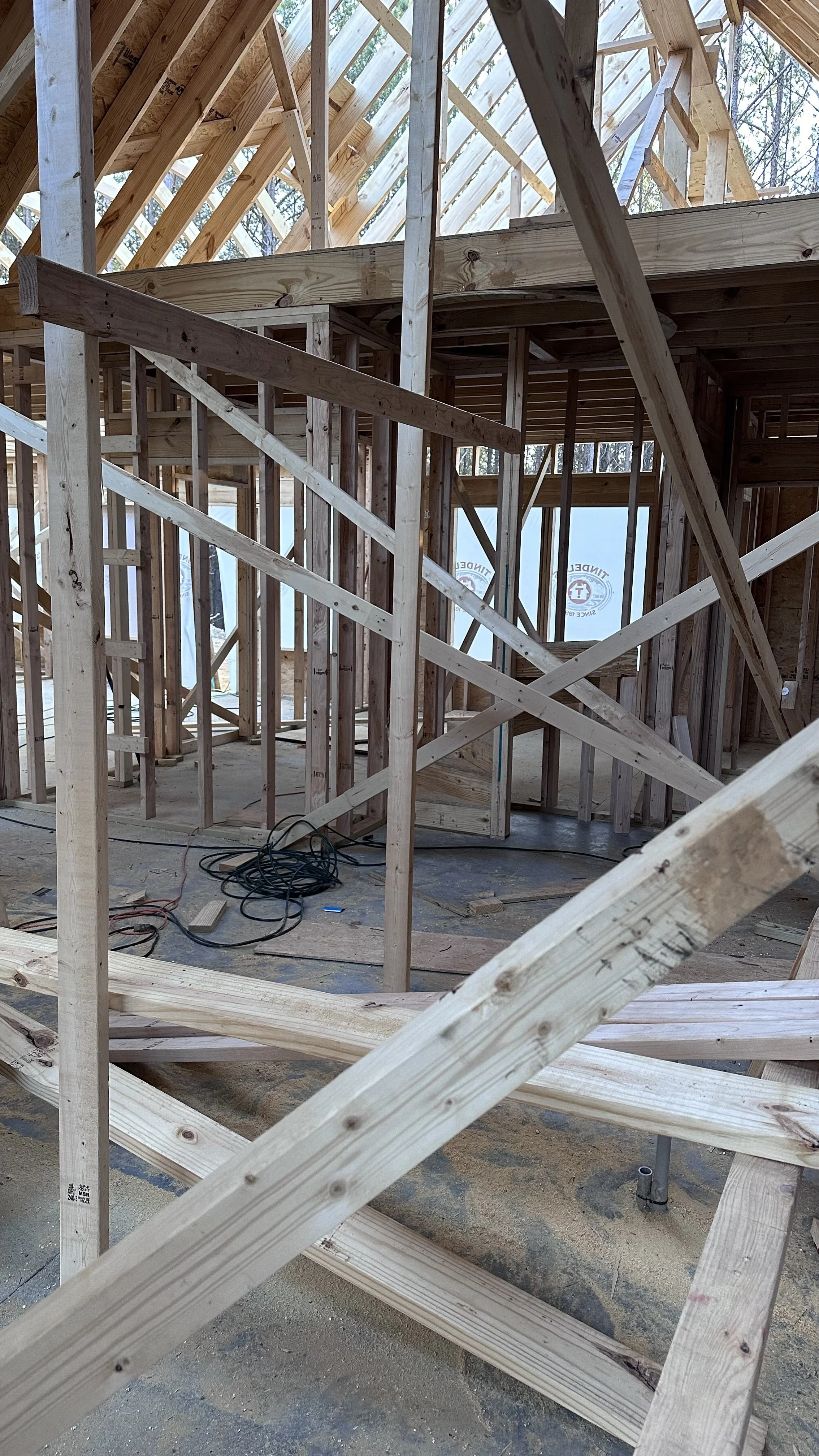 As the framing gave way to roofing and insulation, the home’s signature style took shape—steep rooflines, dark vertical siding, and striking architectural features like the stone-wrapped chimney.