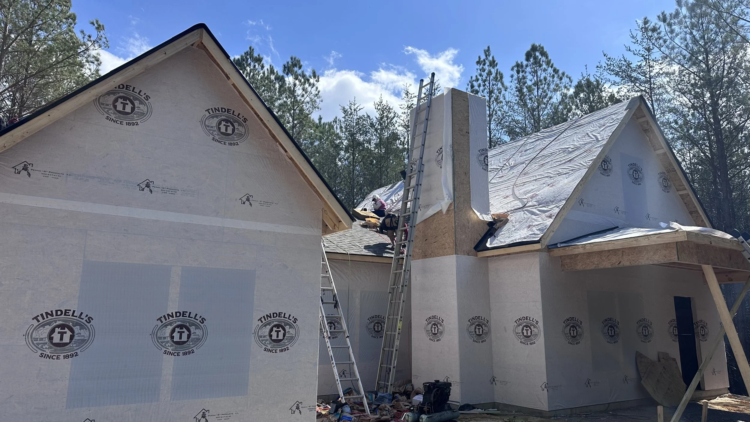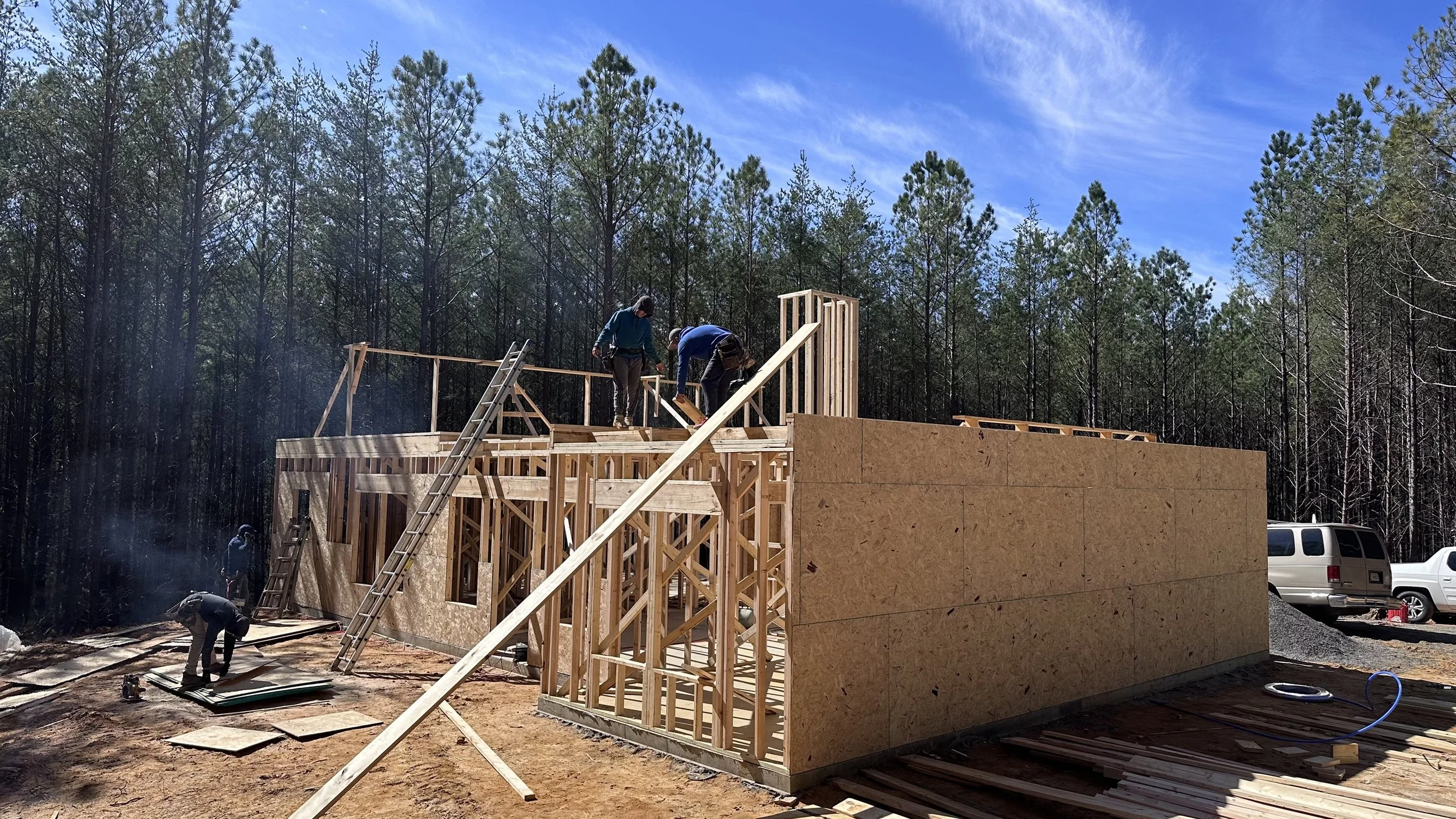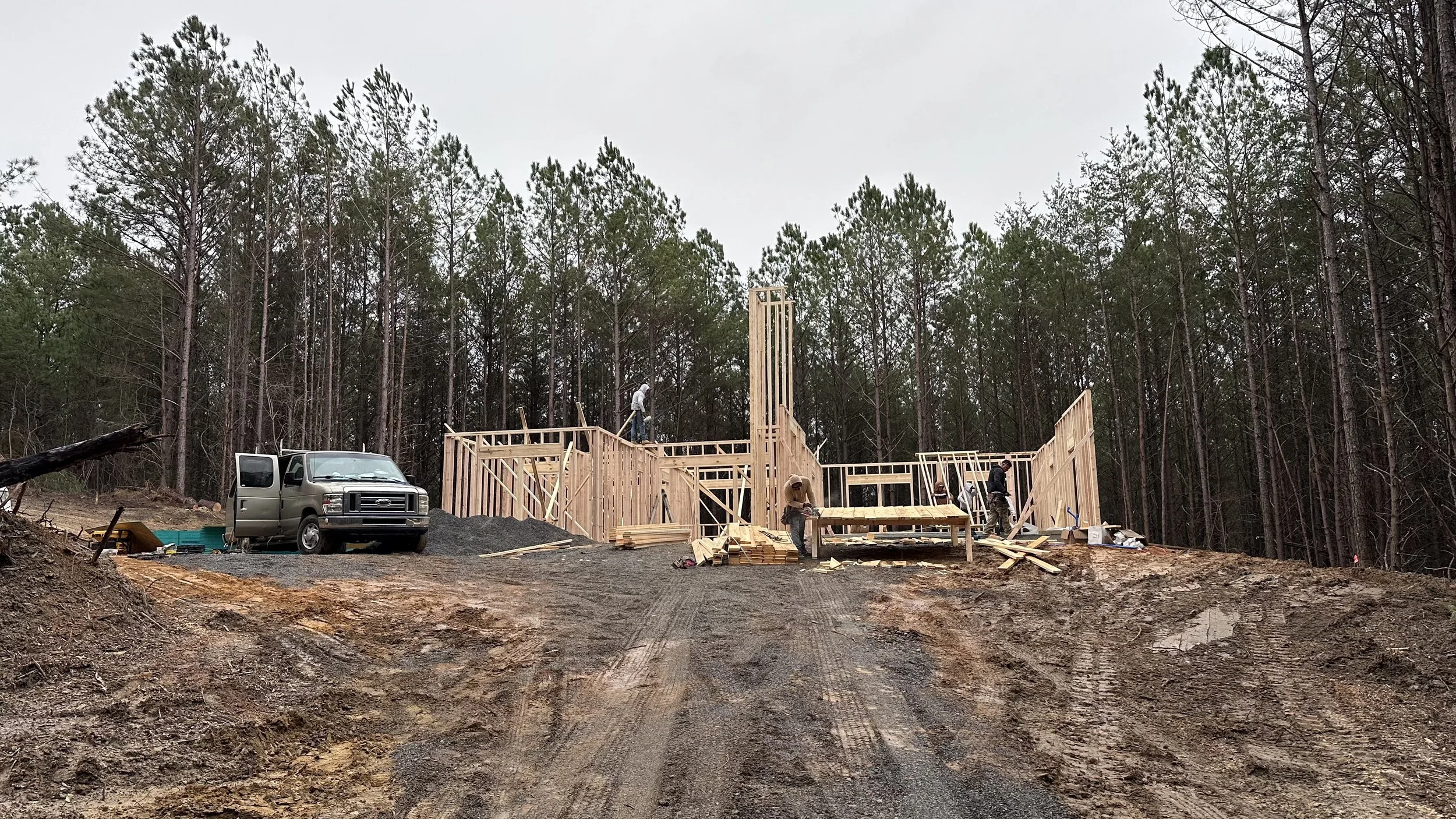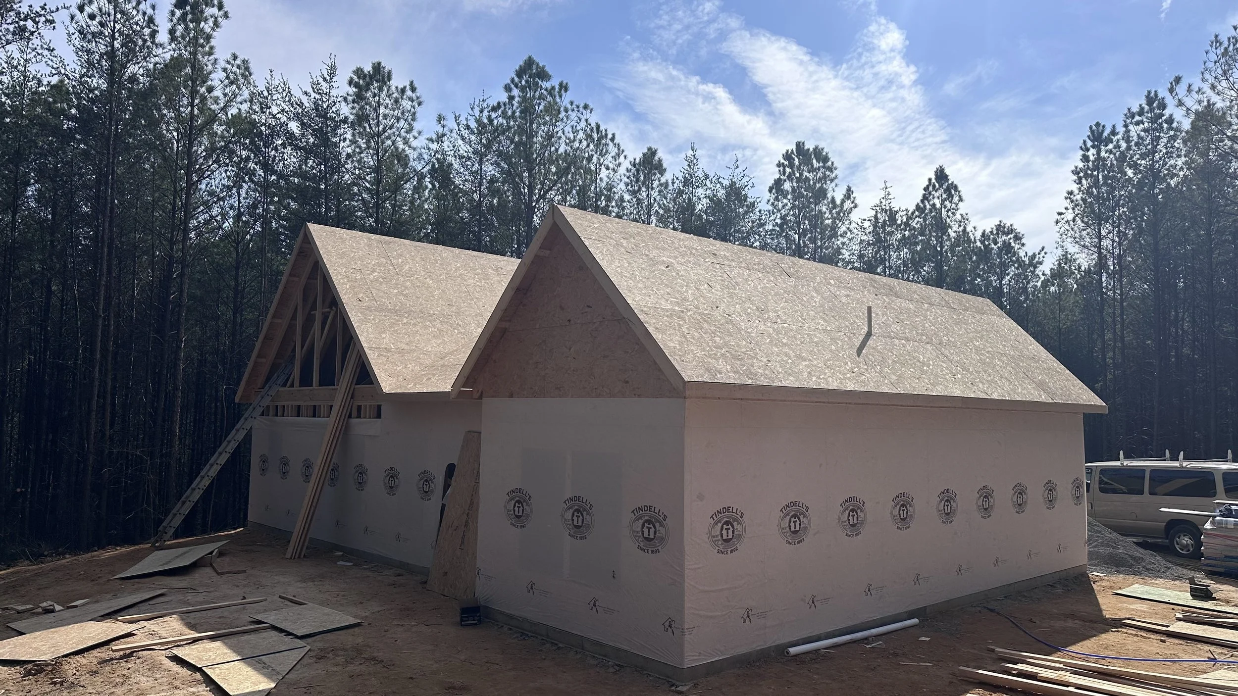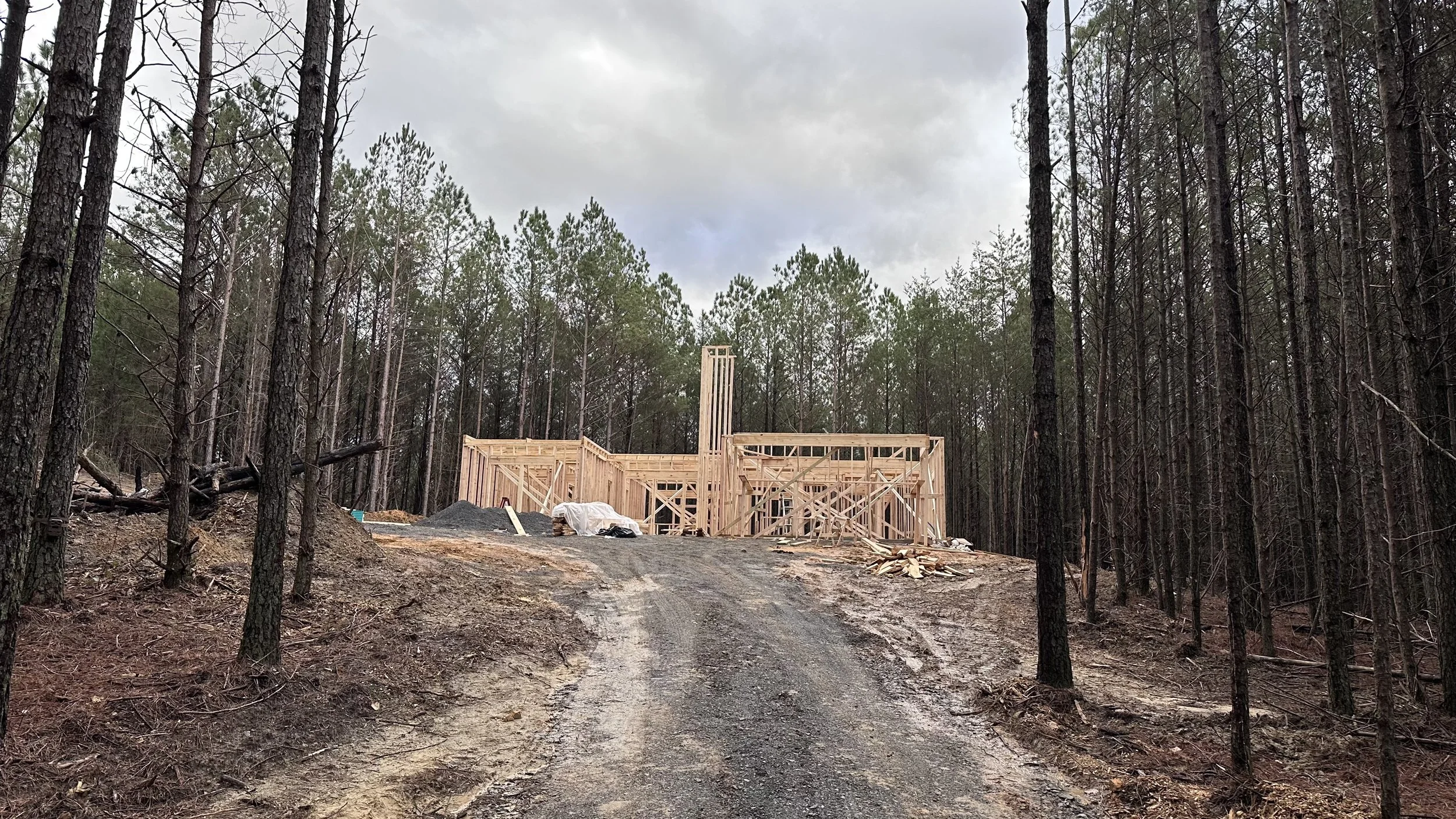 As the framing gave way to roofing and insulation, the home’s signature style took shape—steep rooflines, dark vertical siding, and striking architectural features like the stone-wrapped chimney.