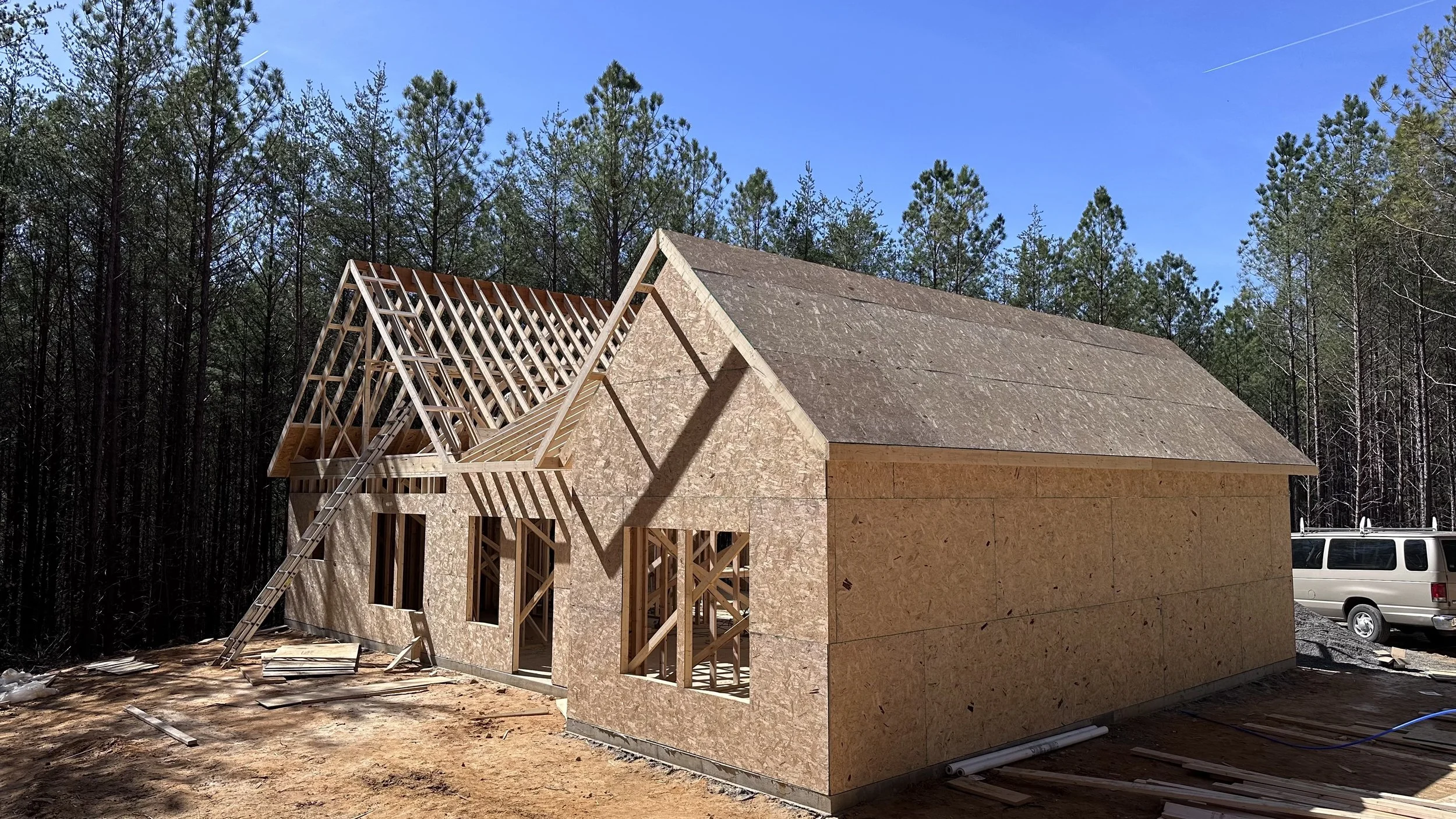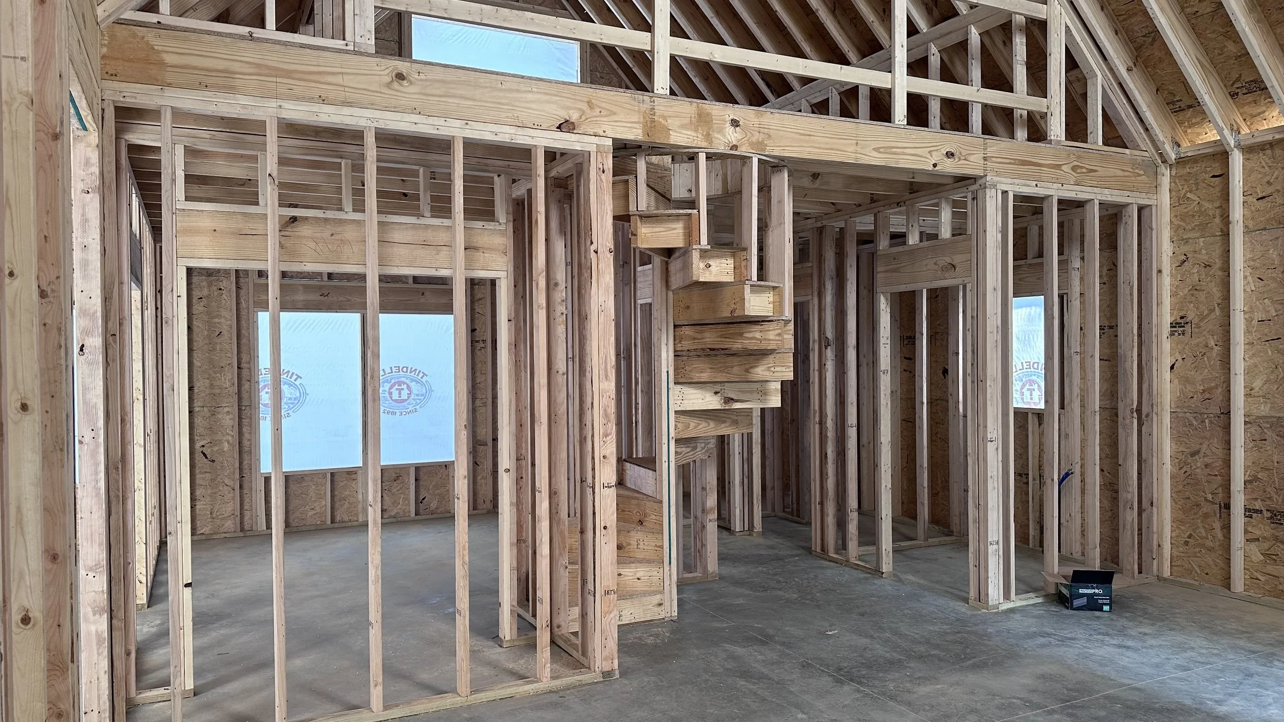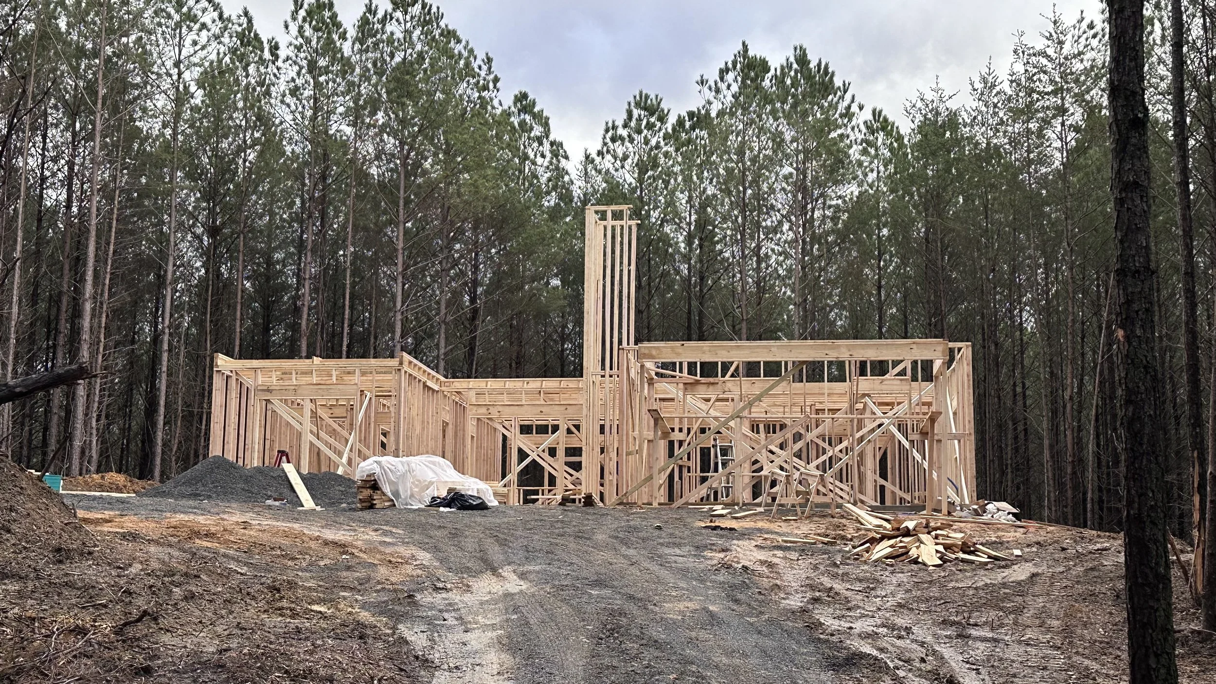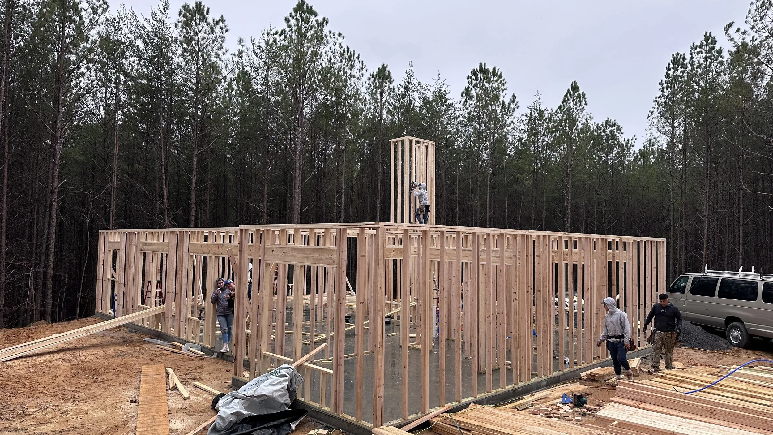 As the framing gave way to roofing and insulation, the home’s signature style took shape—steep rooflines, dark vertical siding, and striking architectural features like the stone-wrapped chimney.