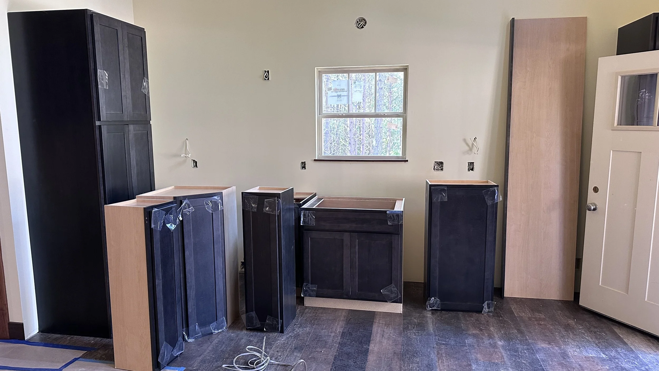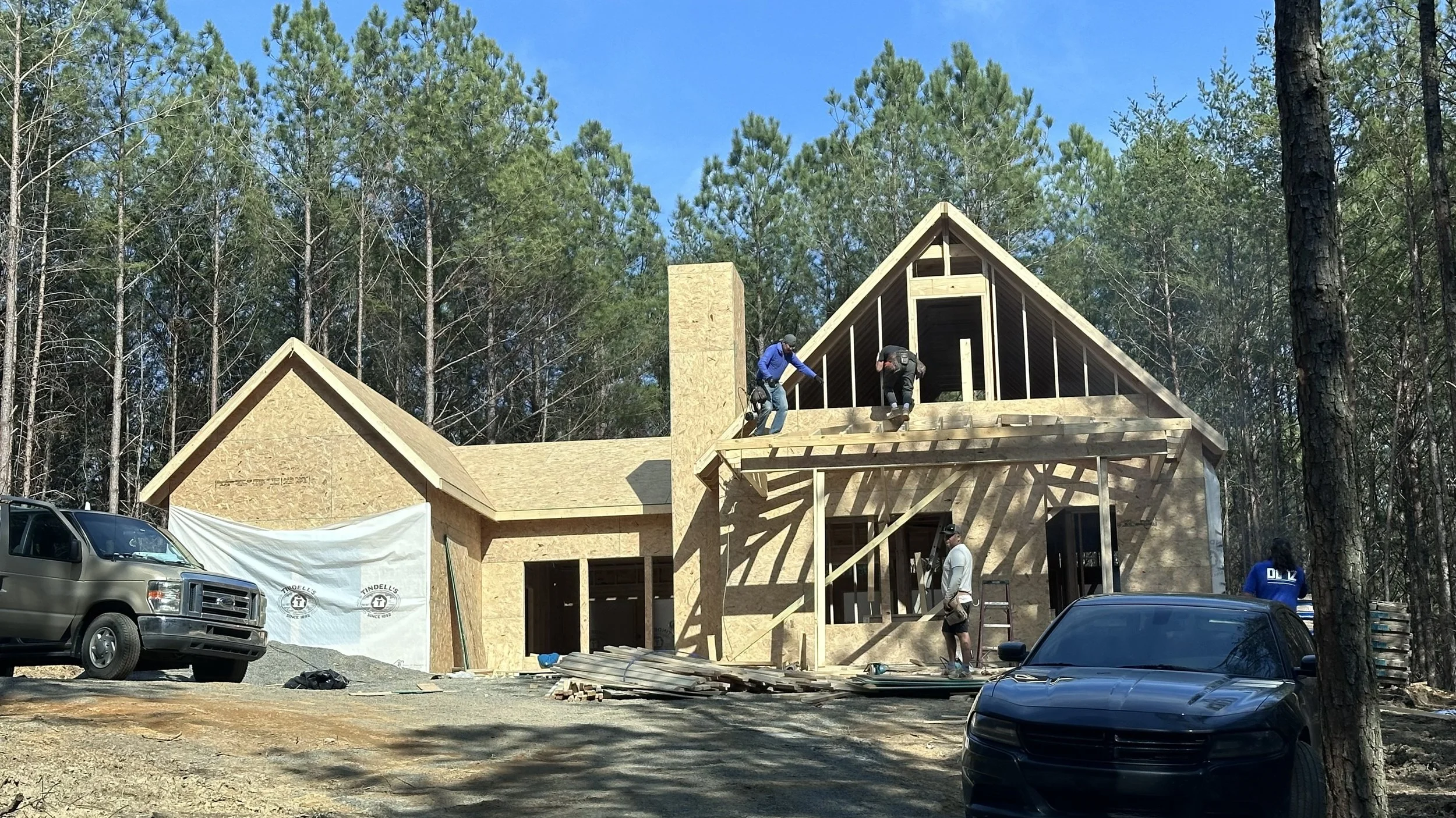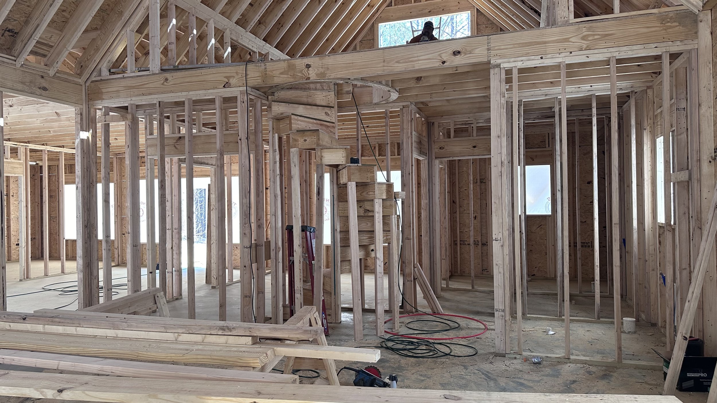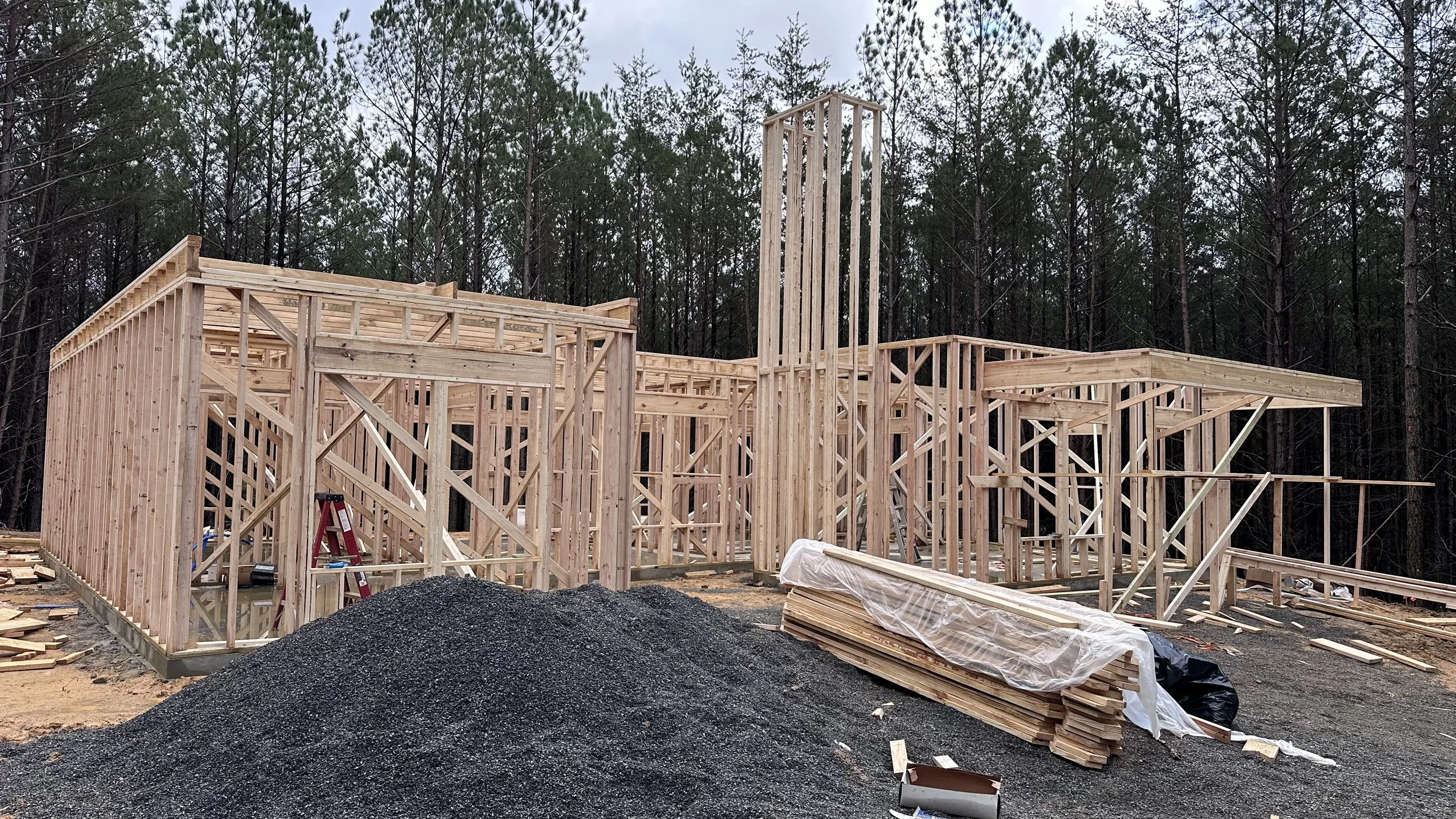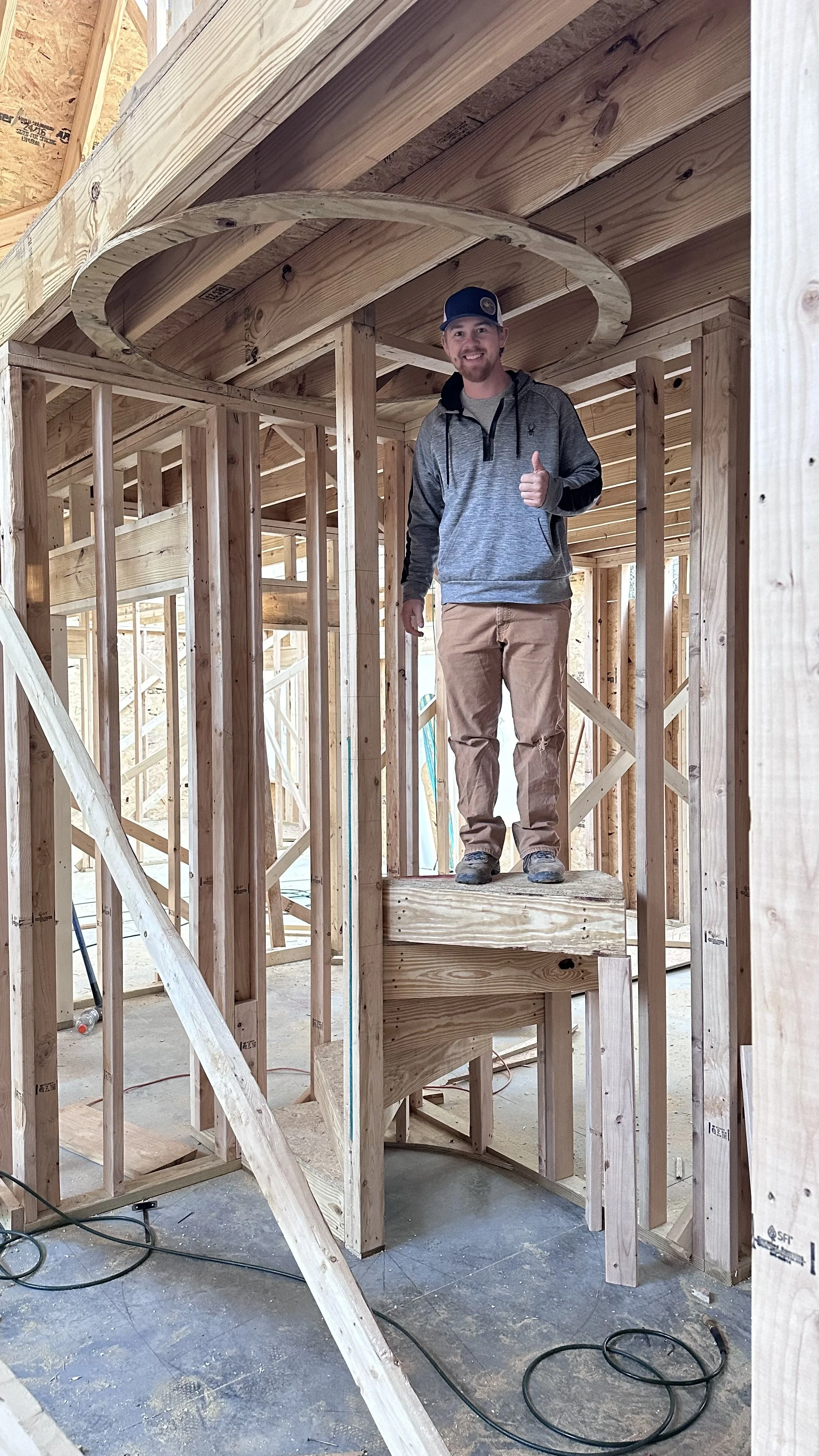 As the framing gave way to roofing and insulation, the home’s signature style took shape—steep rooflines, dark vertical siding, and striking architectural features like the stone-wrapped chimney.
