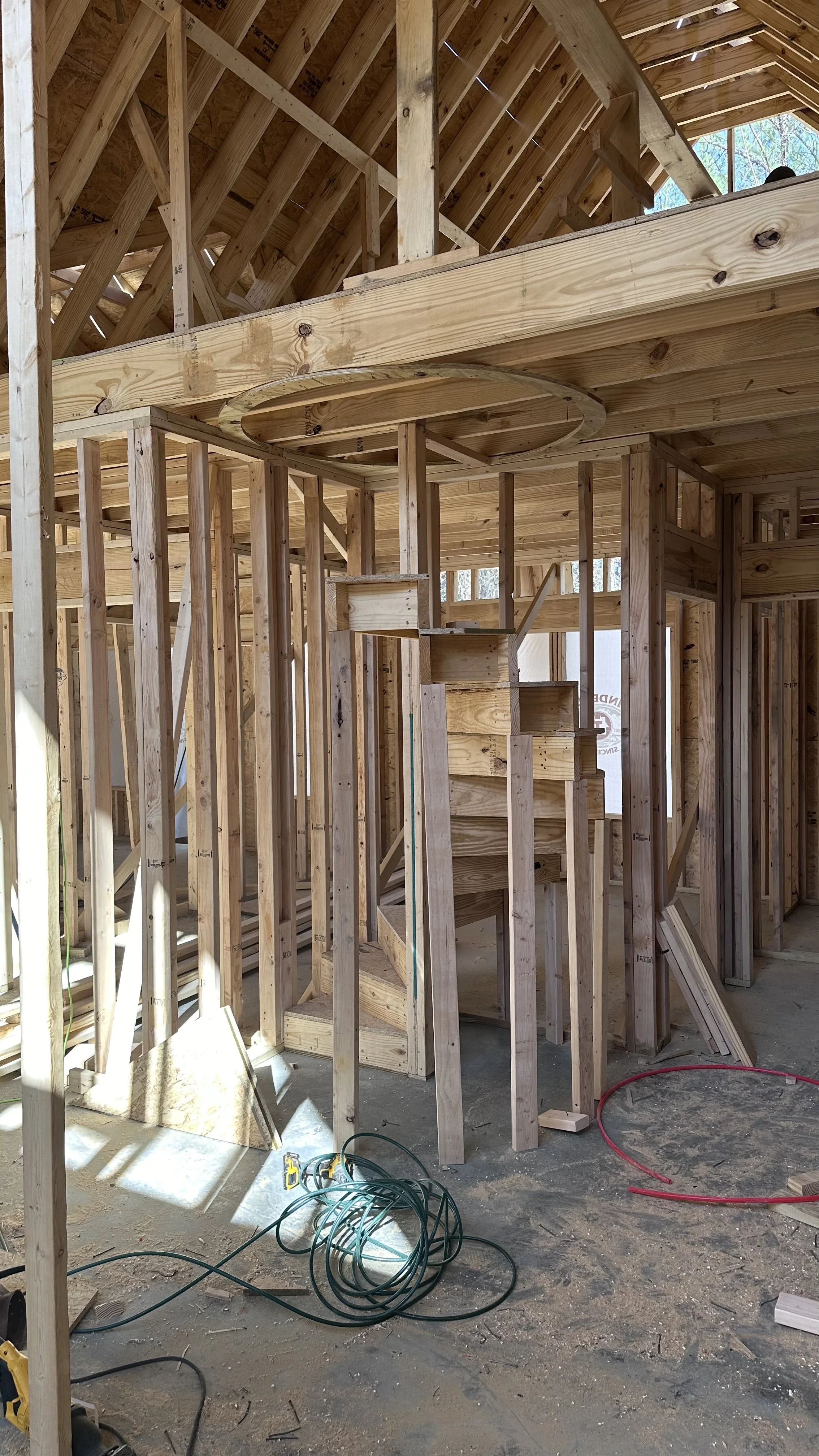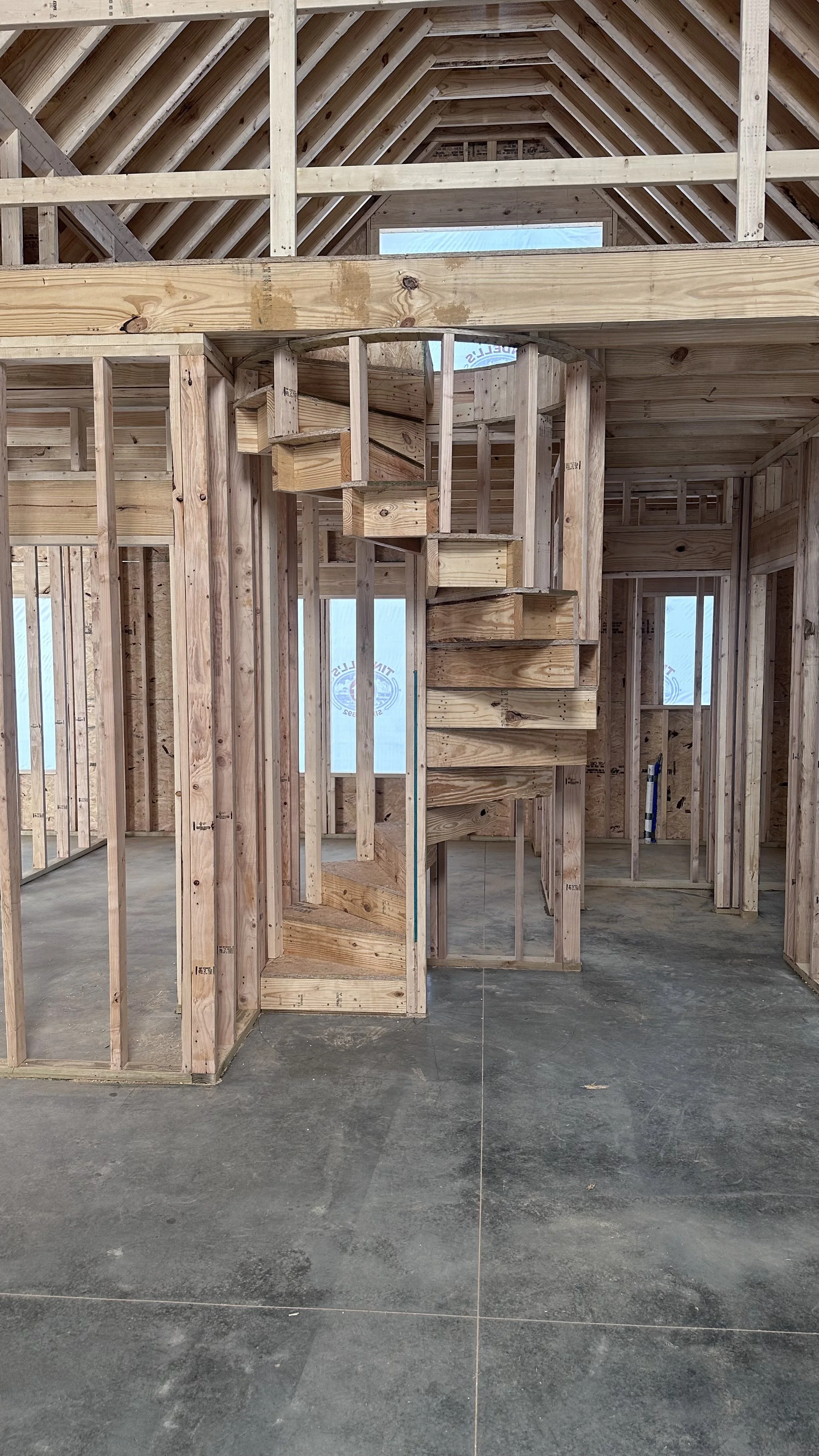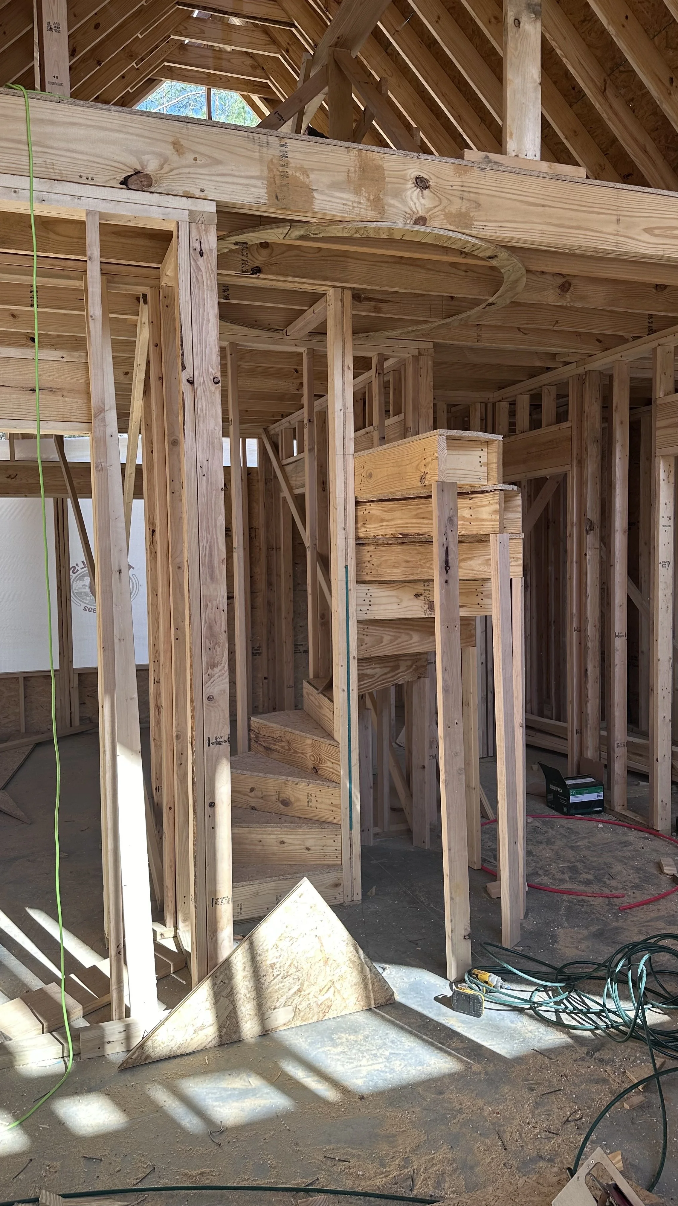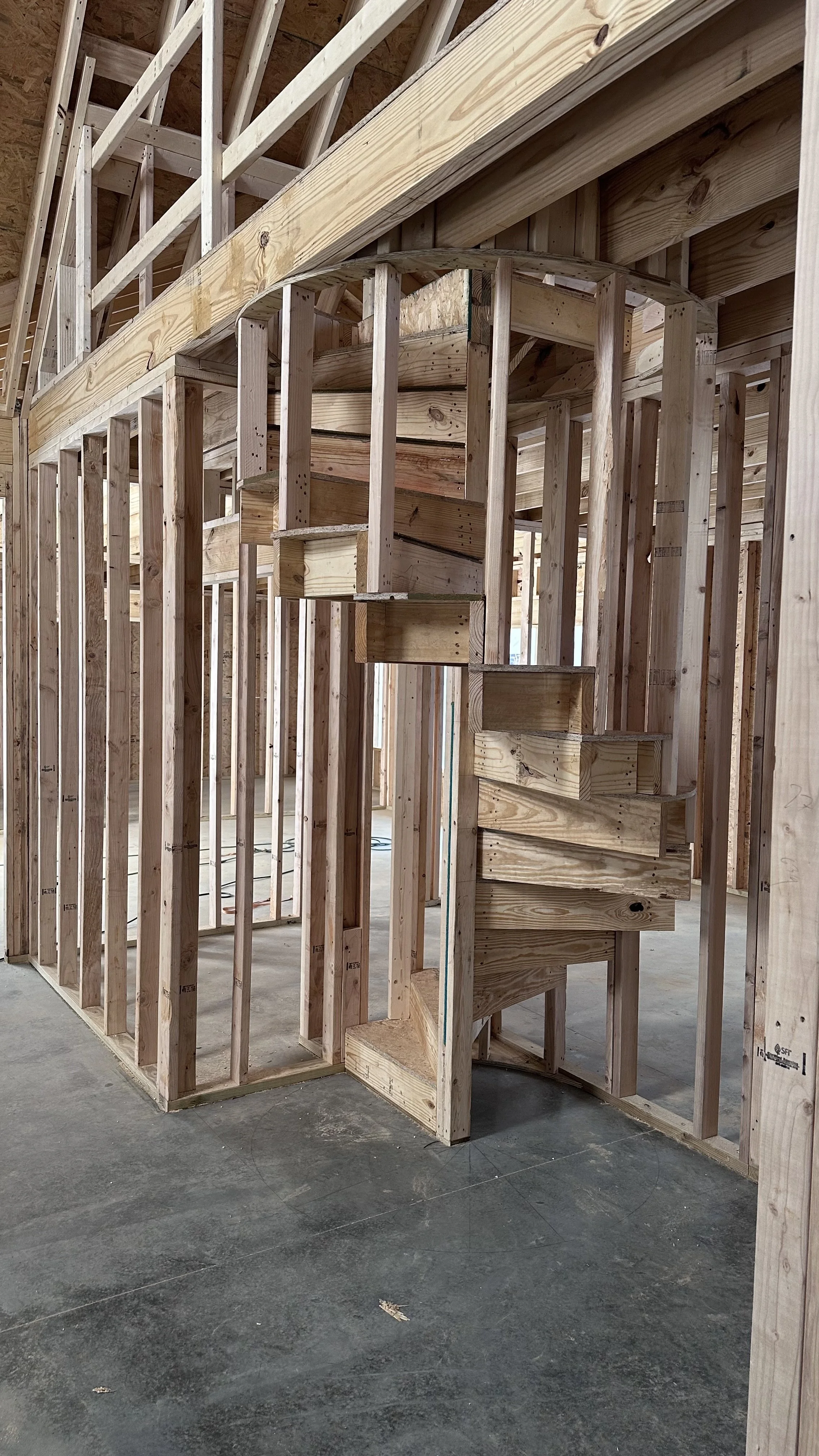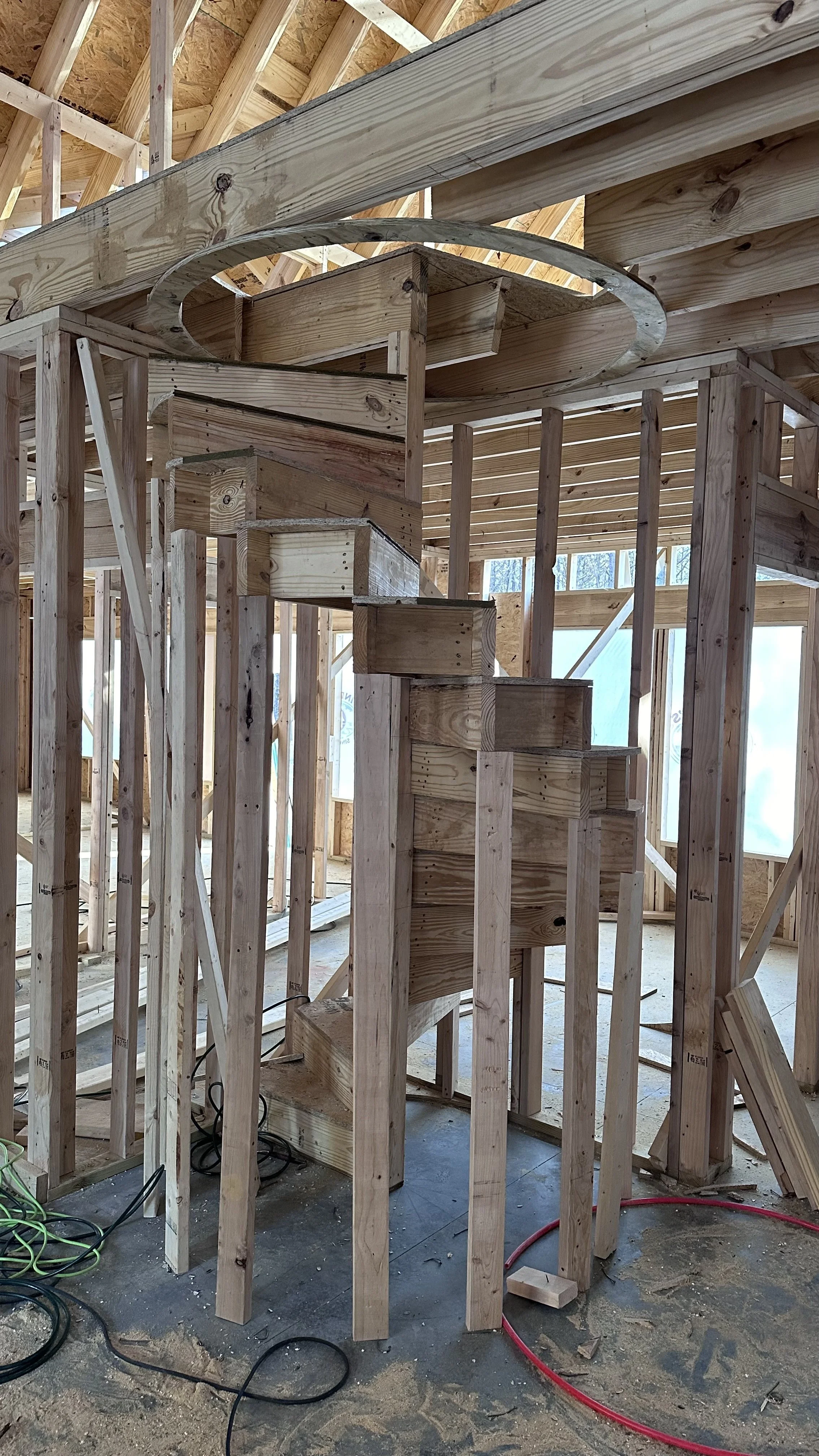 The structure began with concrete prep and framework laid into the hillside, progressing into a carefully crafted wood frame with vaulted ceilings, a custom-built spiral staircase, and a spacious loft area.