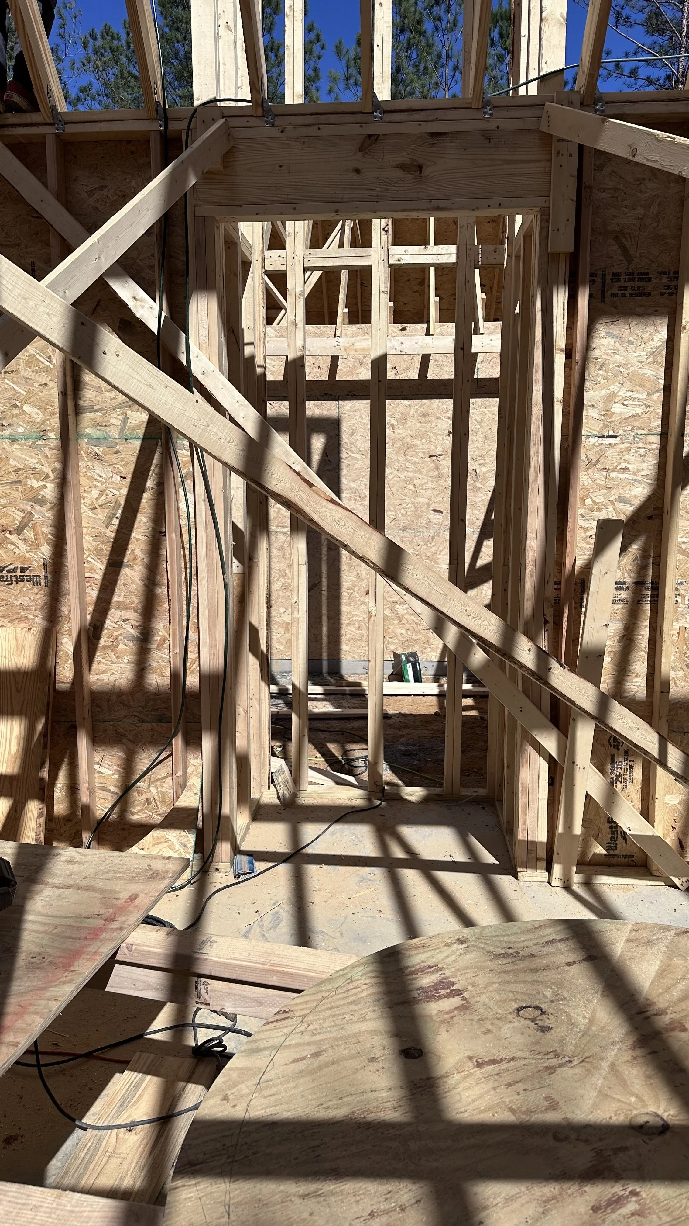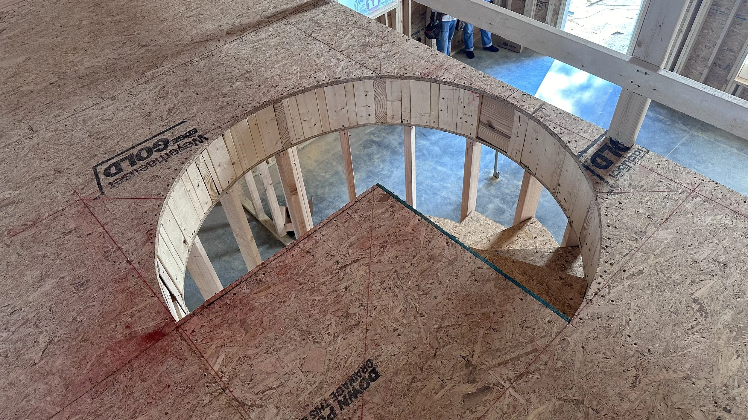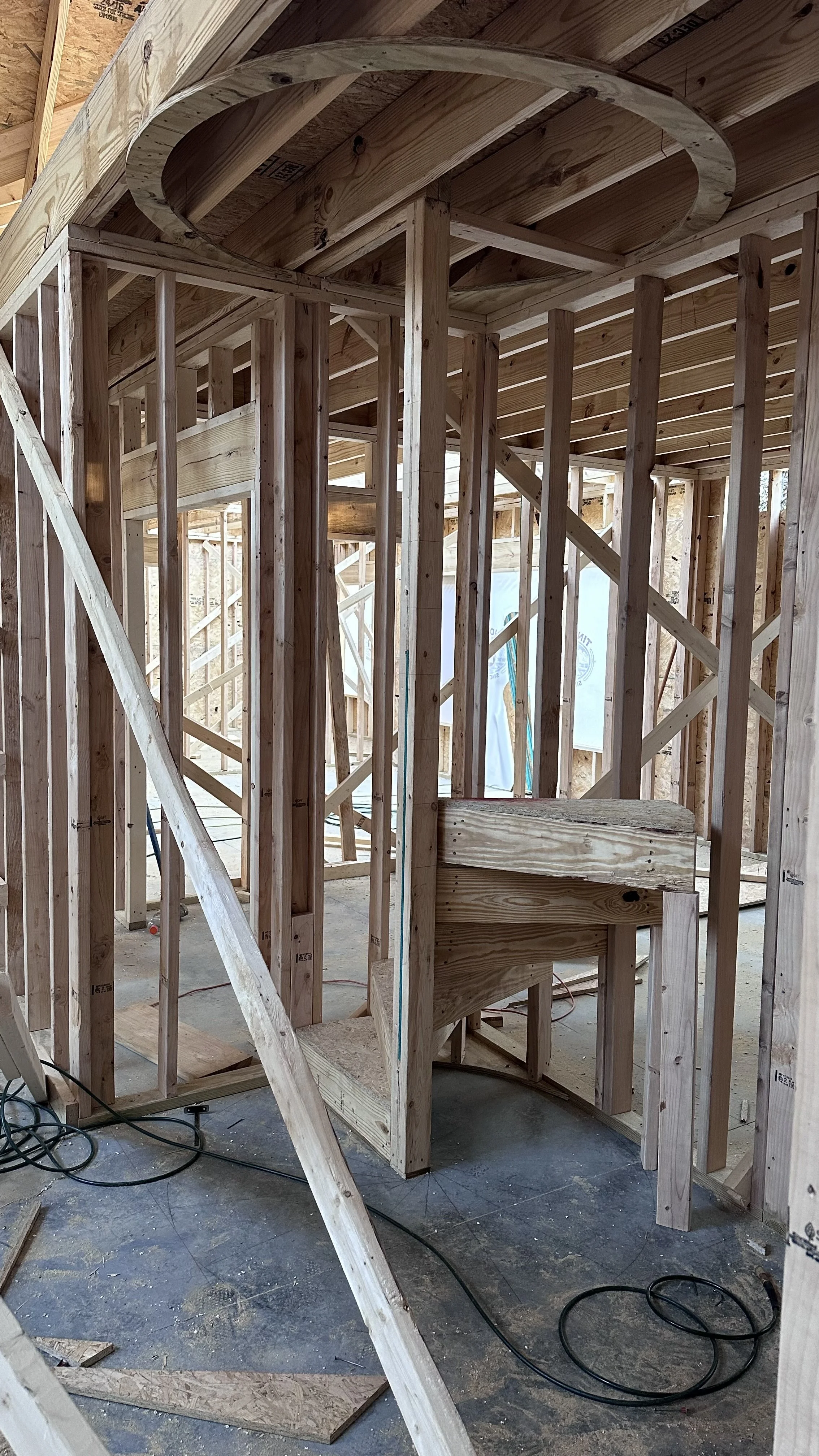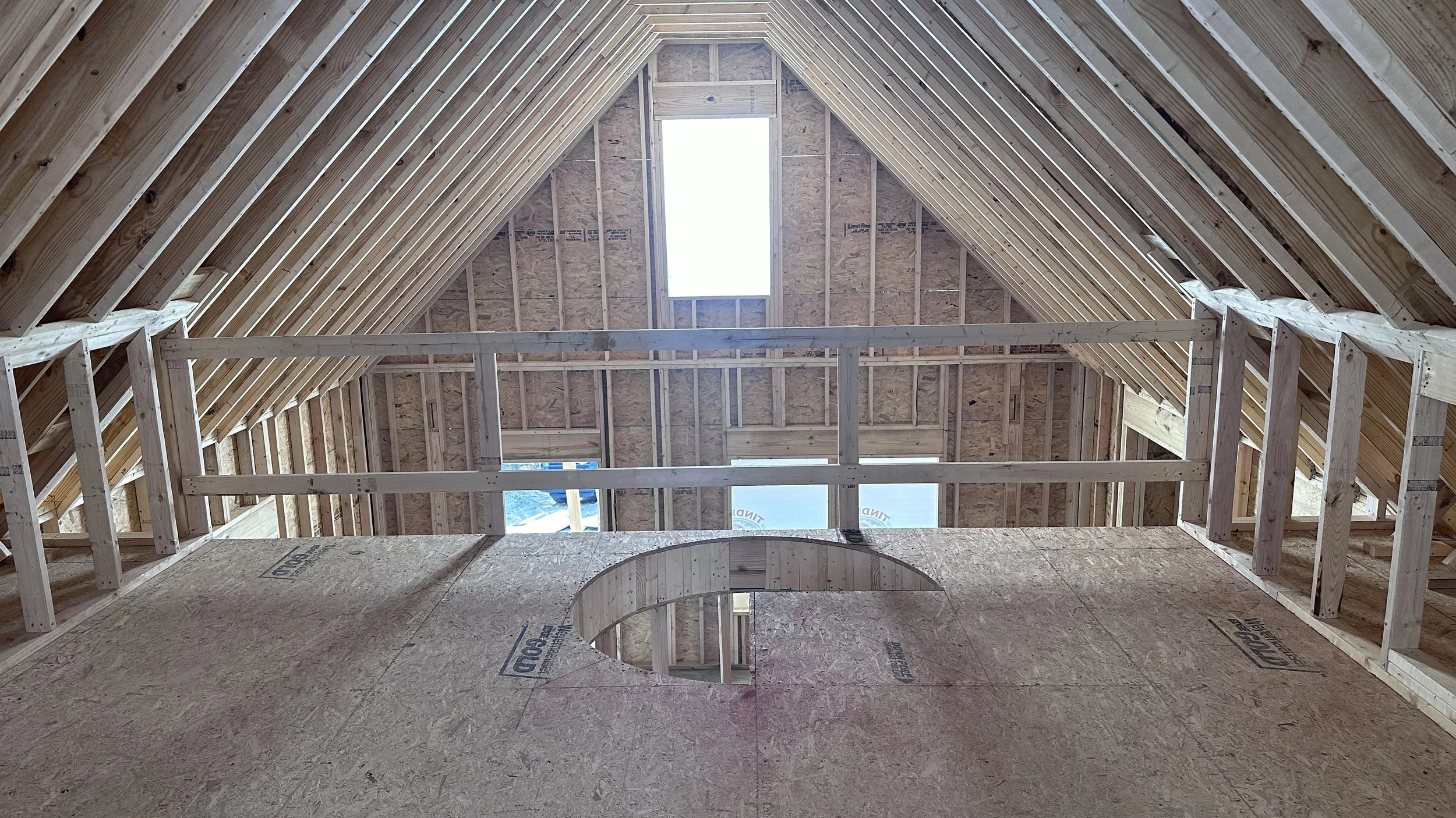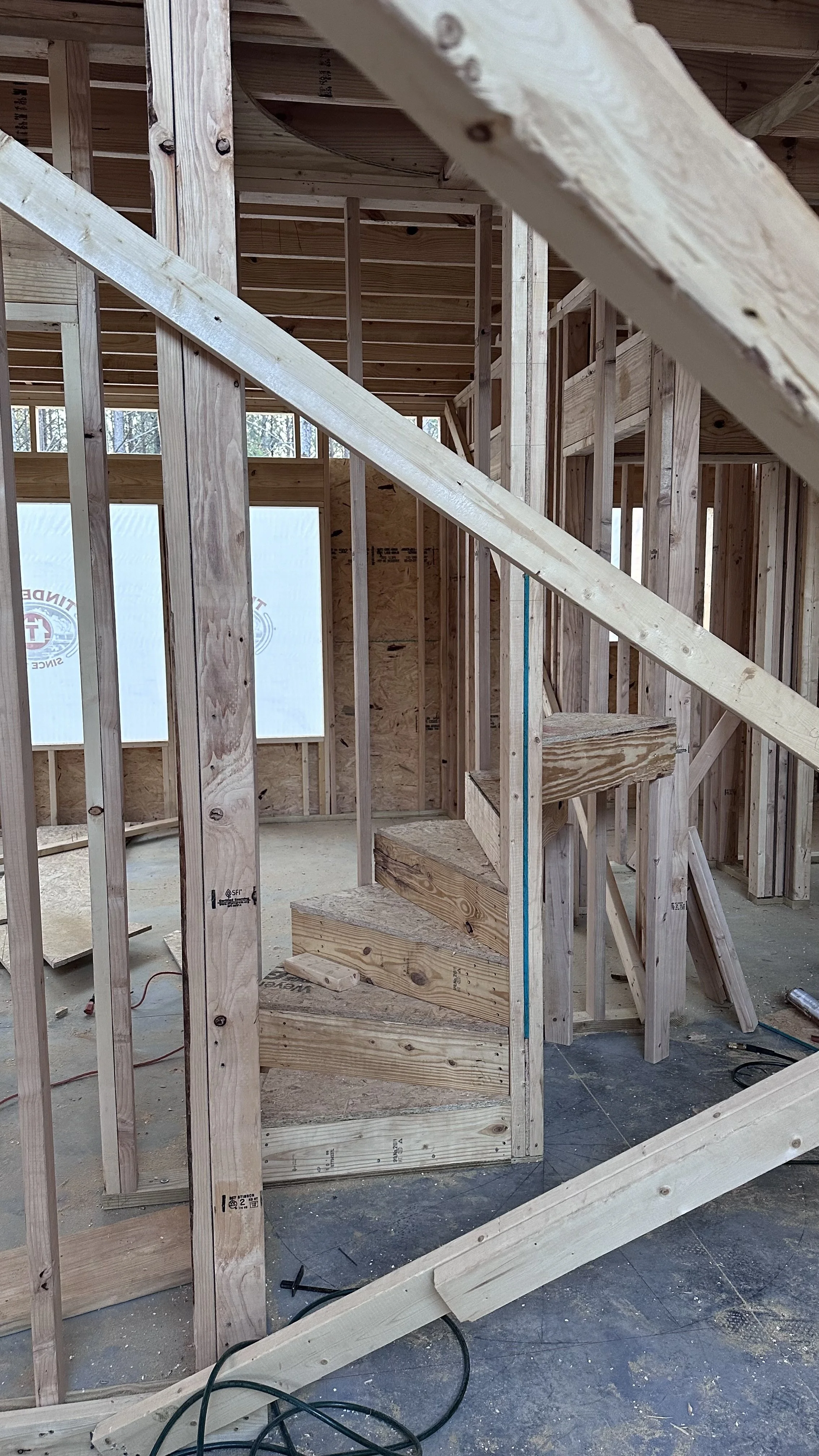 The structure began with concrete prep and framework laid into the hillside, progressing into a carefully crafted wood frame with vaulted ceilings, a custom-built spiral staircase, and a spacious loft area.