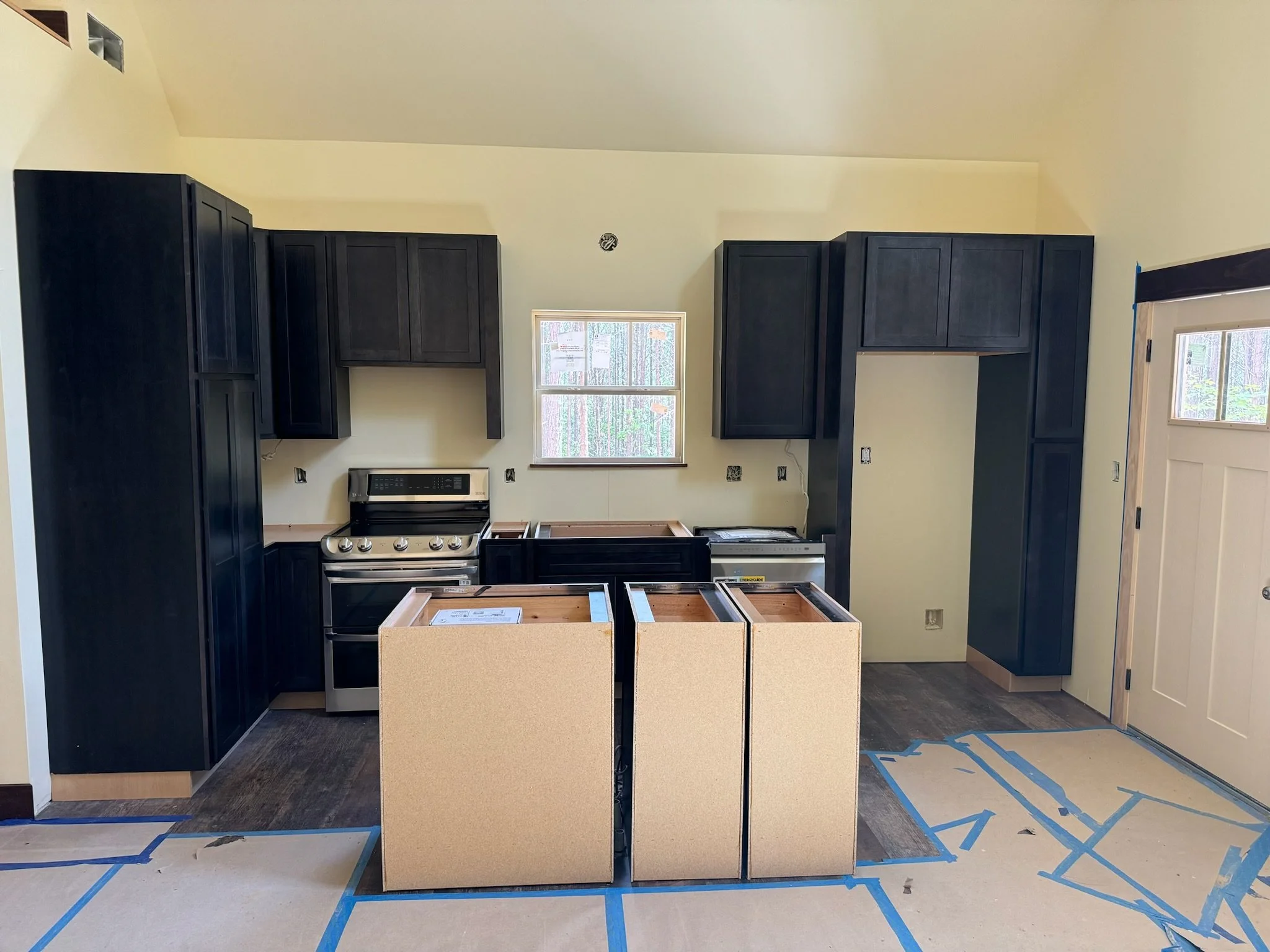 Inside, the kitchen features black shaker cabinetry, butcher block countertops, and pendant lighting, bringing warmth and simplicity to the space. The open floor plan, high ceilings, and large windows create a bright, inviting interior that contrasts beautifully with the deep tones of the exterior.