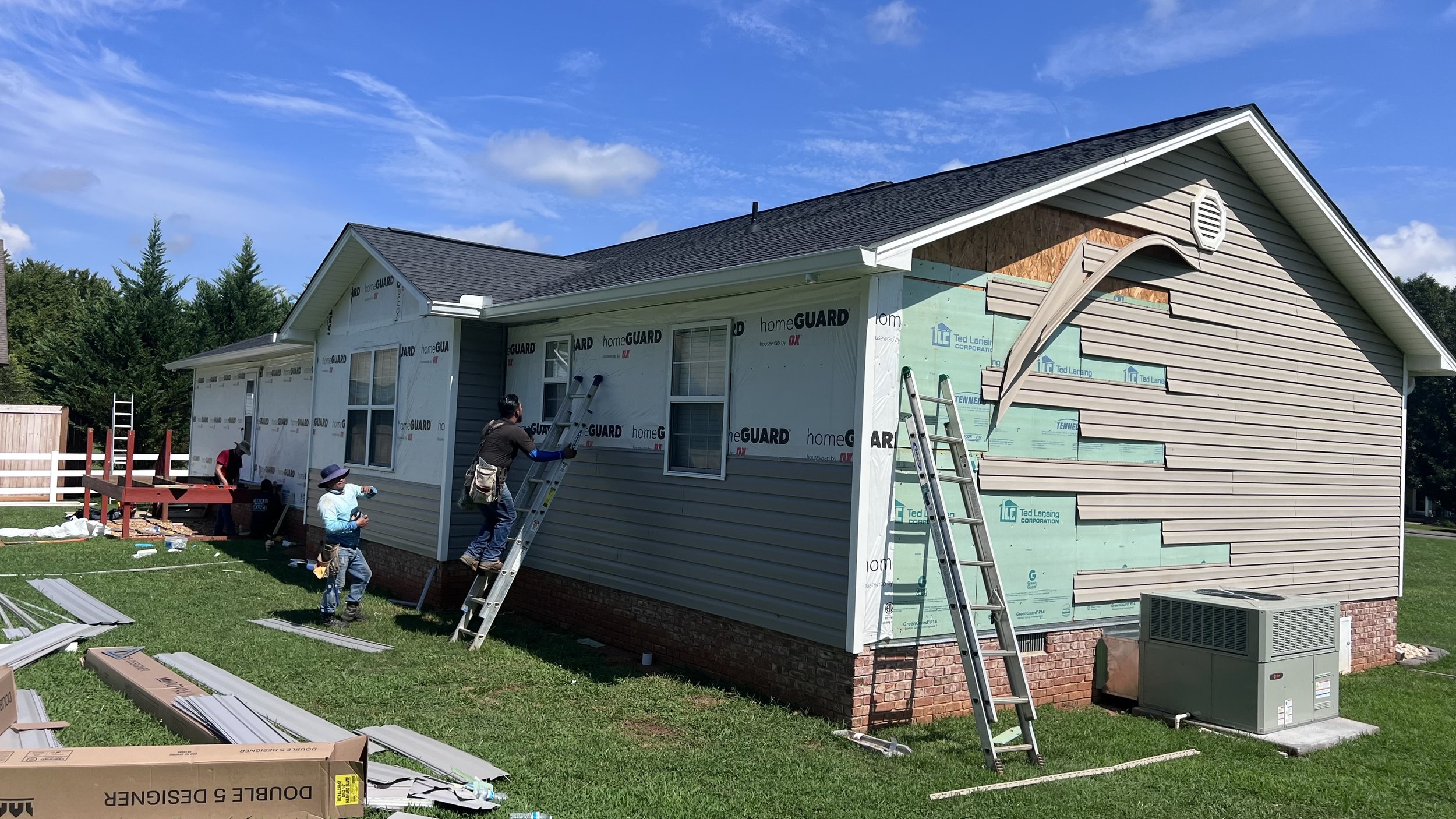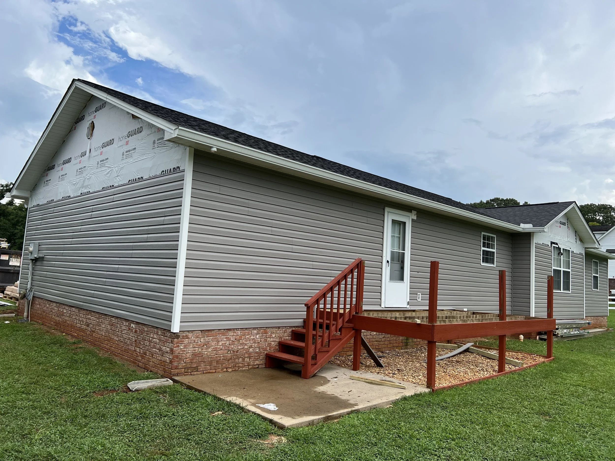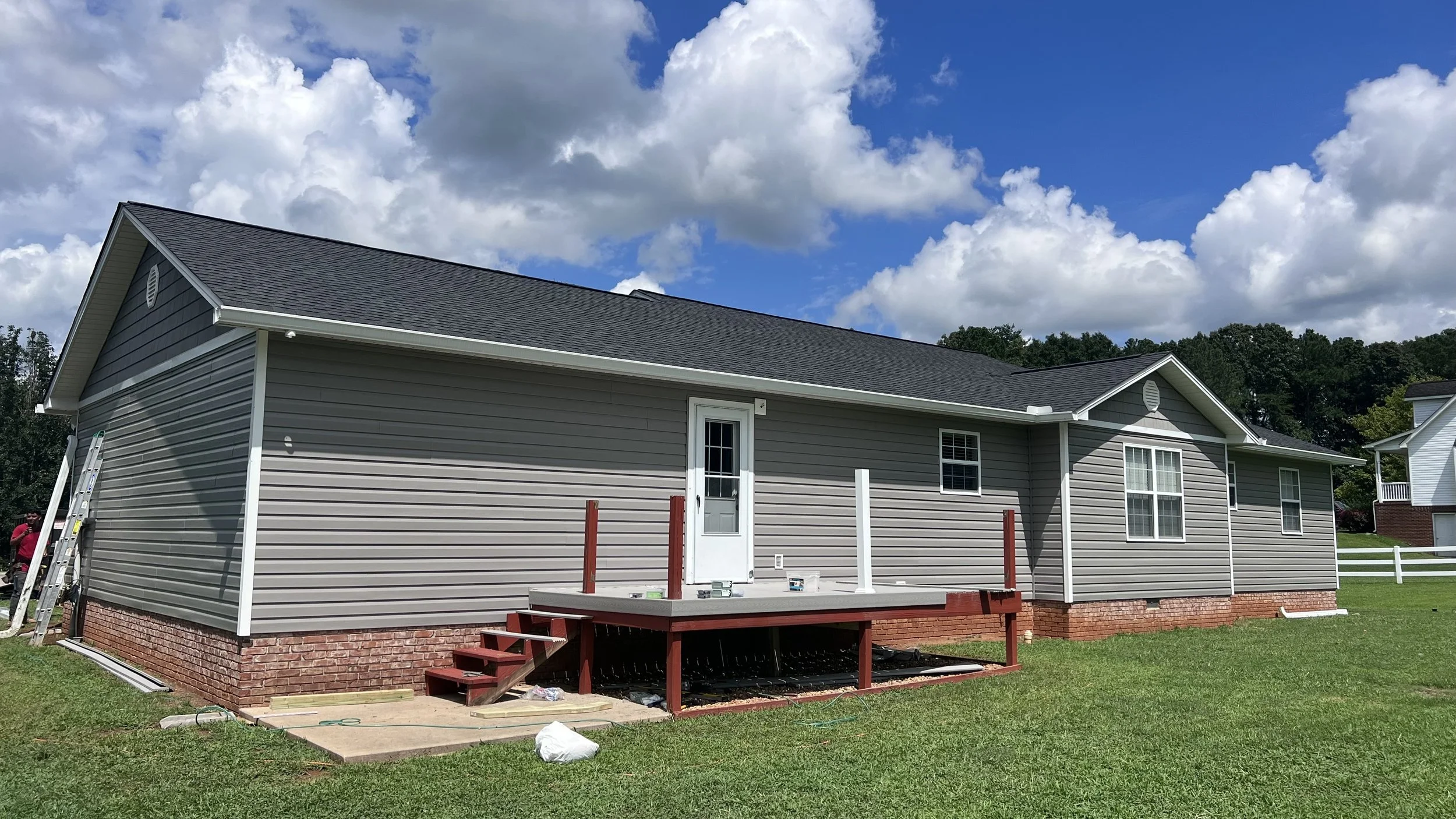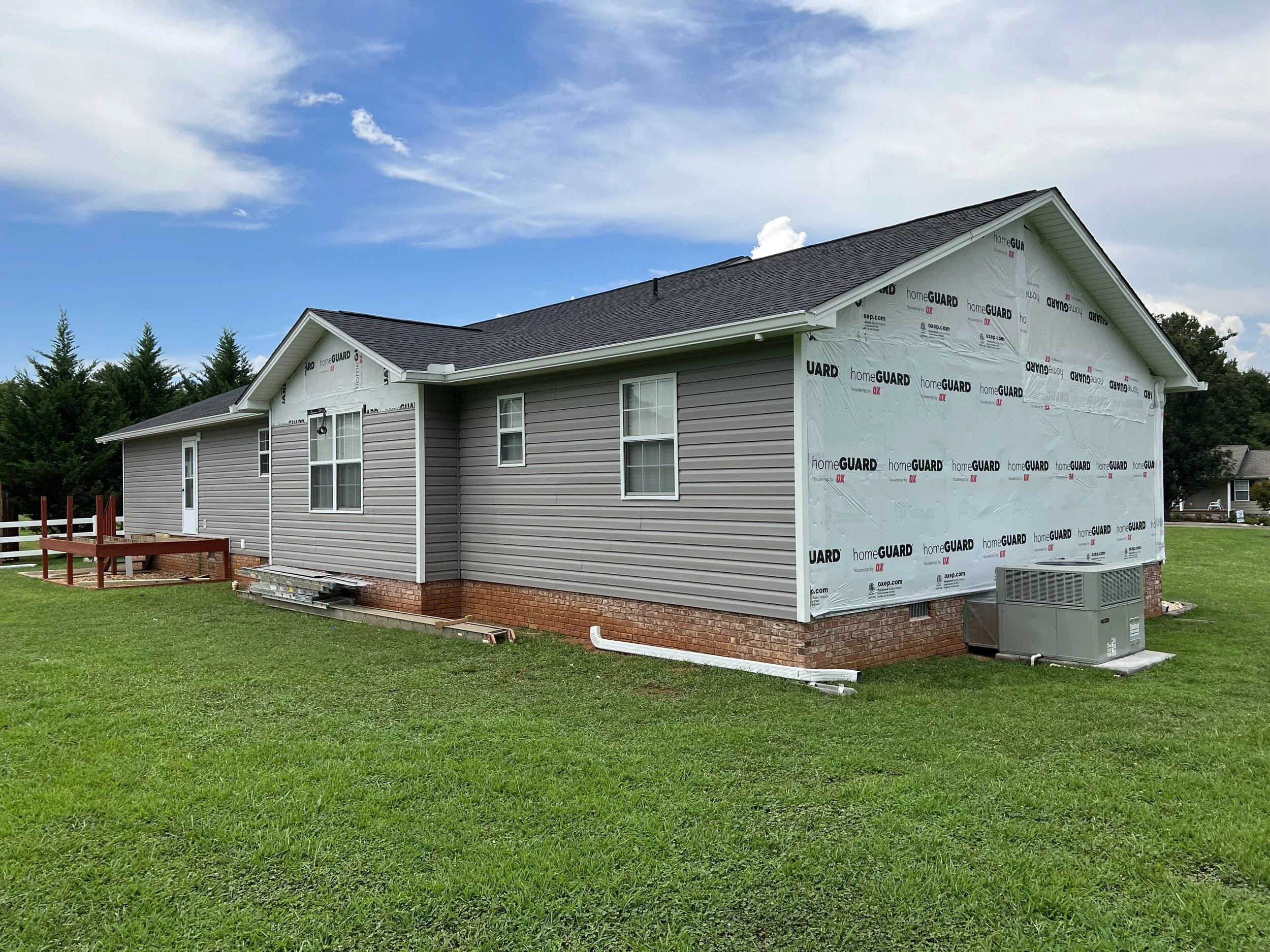 The transformation began with a complete siding replacement. We removed the existing exterior cladding and installed HomeGuard house wrap for superior moisture protection before applying new gray vinyl siding throughout.