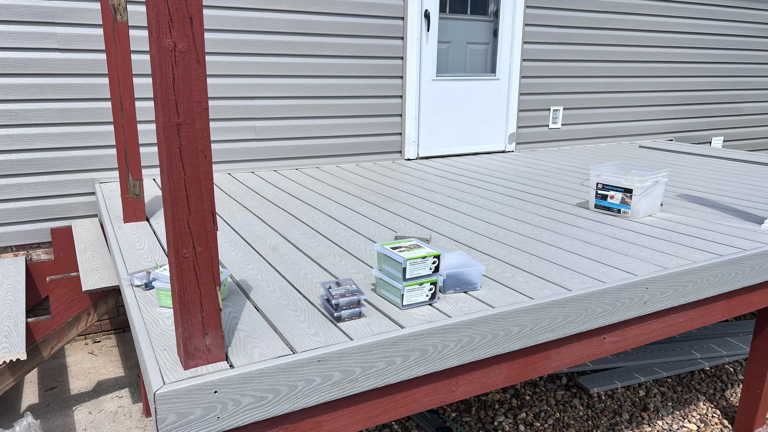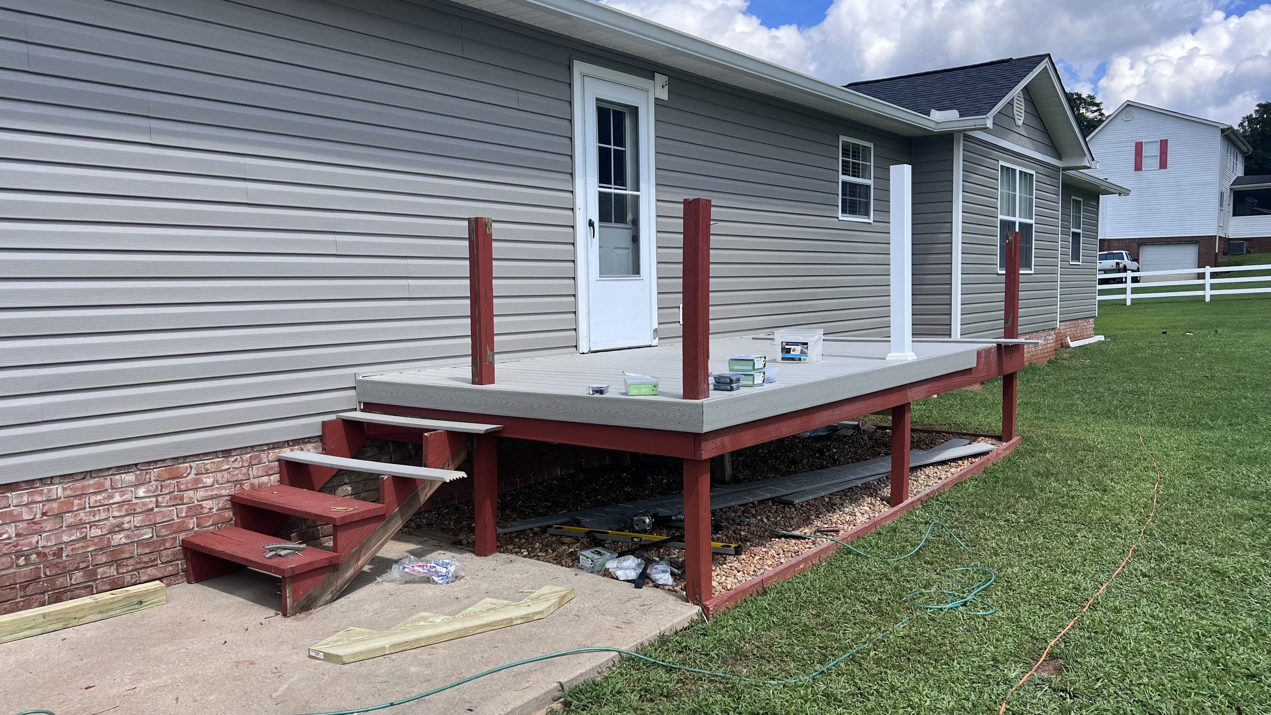 Simultaneously, we constructed a beautiful composite deck with distinctive red-stained support posts and white vinyl railing. The project progressed from bare framing to a finished outdoor living space that provides the homeowners with additional room for relaxation and entertainment.