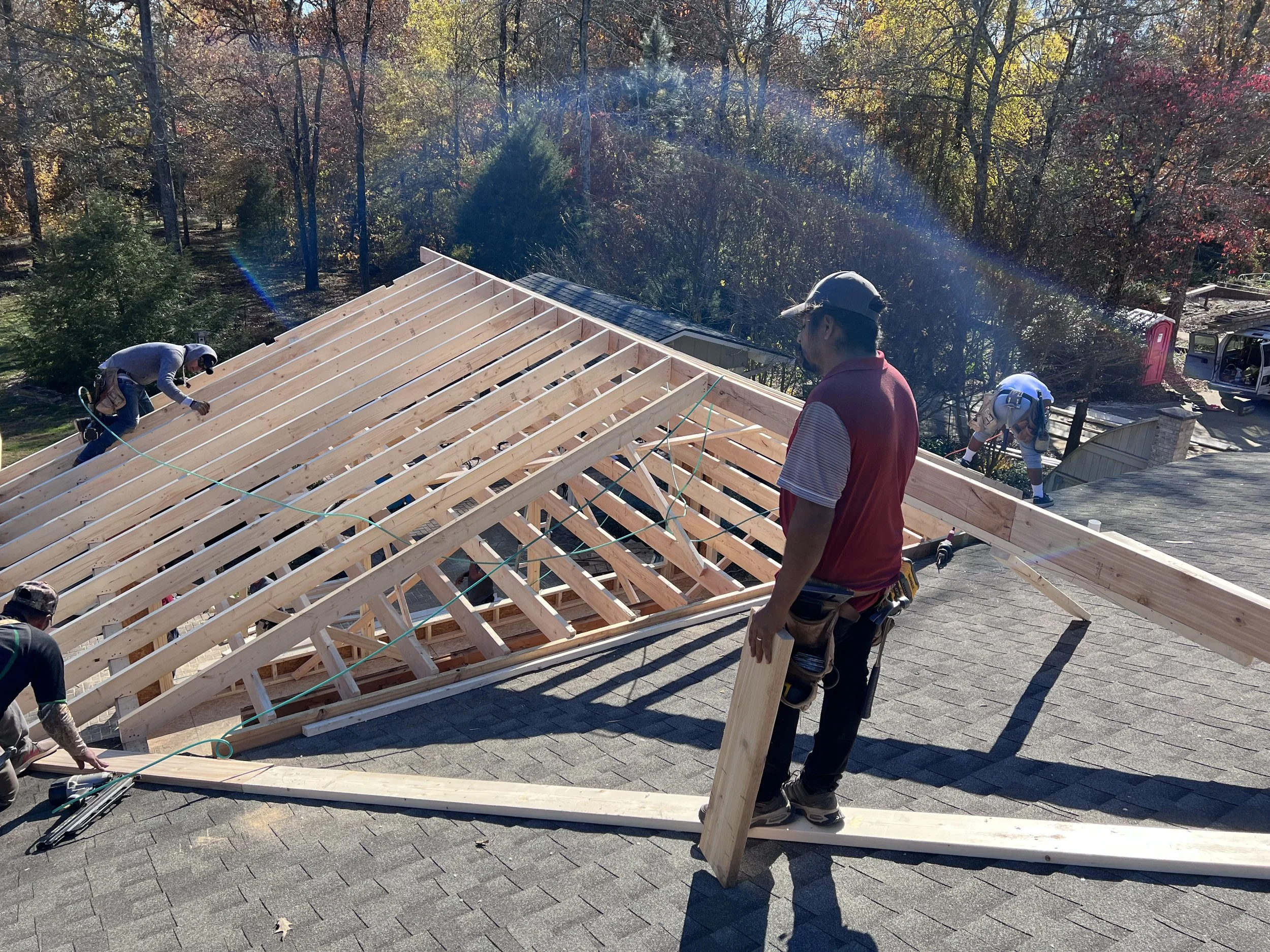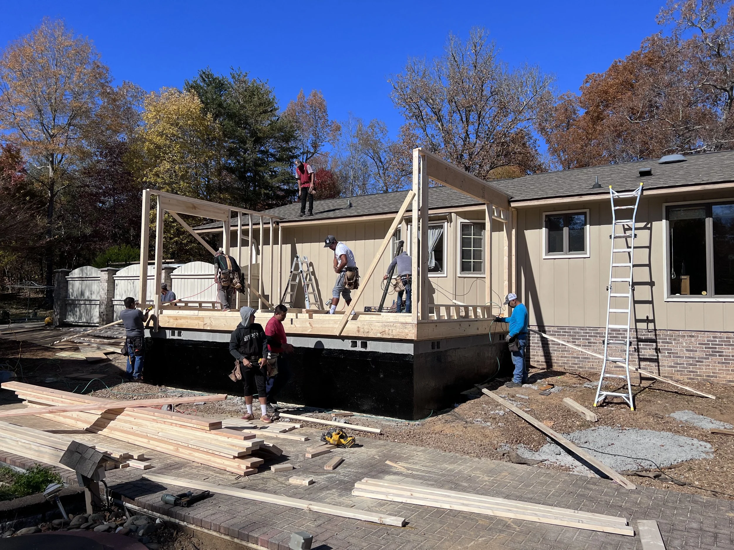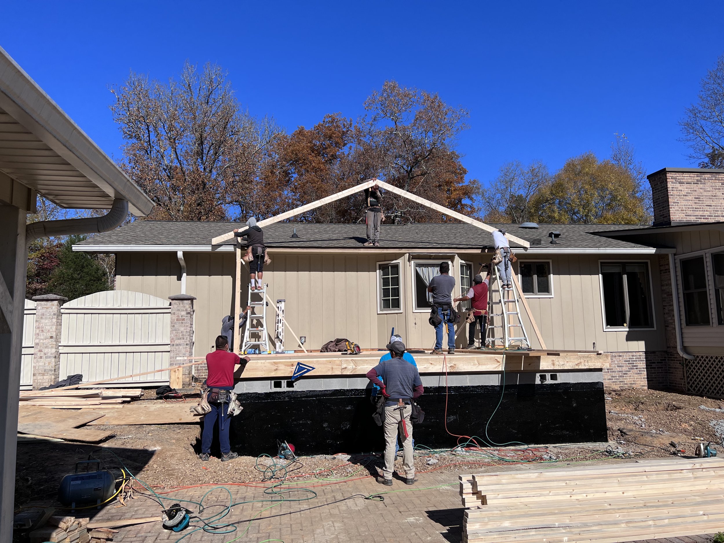 The project involved a full-scale structural build, starting with foundation prep and framing, followed by an intricately pitched roofline that ties seamlessly into the existing home.