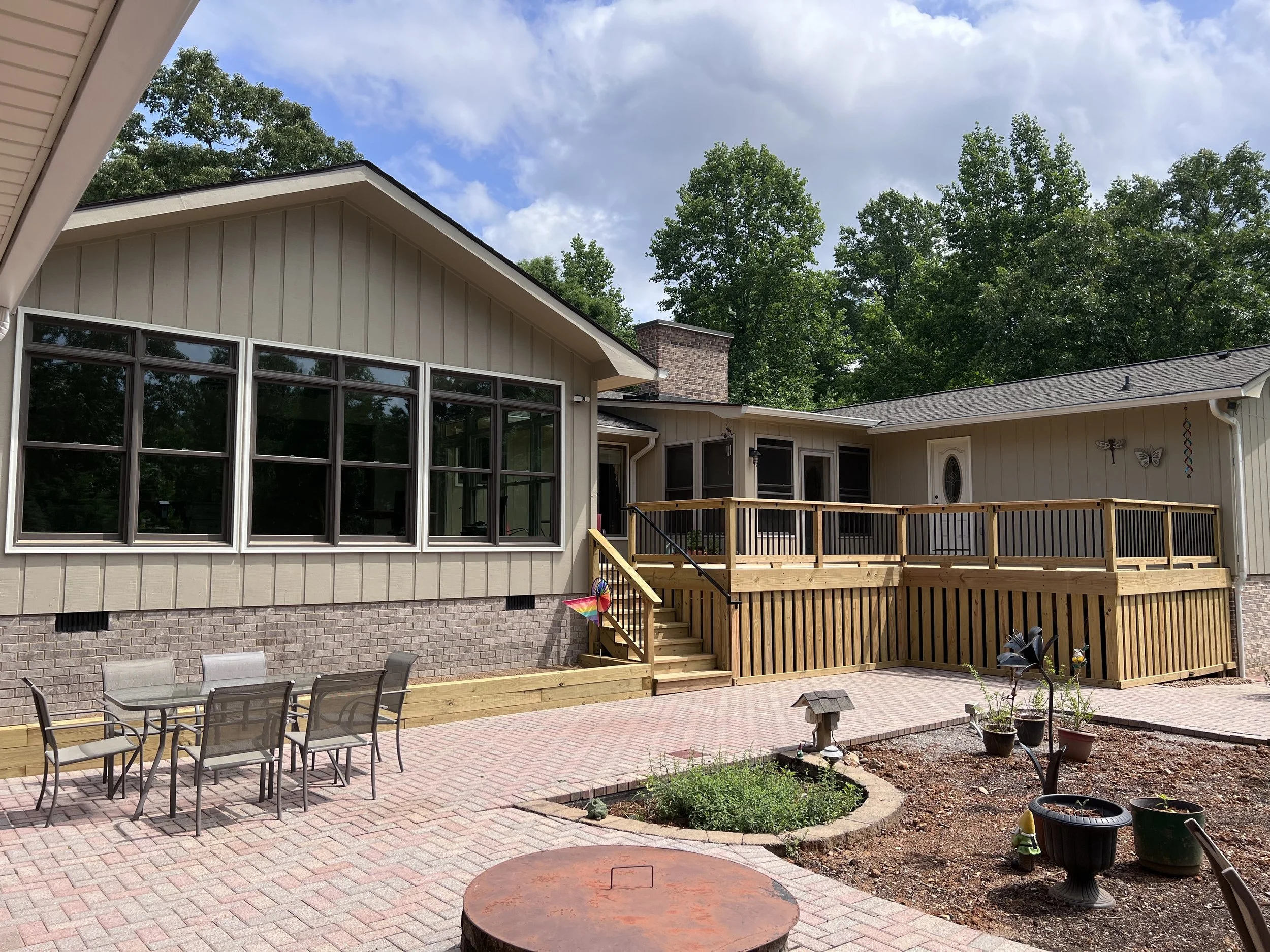 What began as an open patio space is now a beautifully integrated sunroom and deck addition that enhances the home's functionality, comfort, and aesthetic appeal.